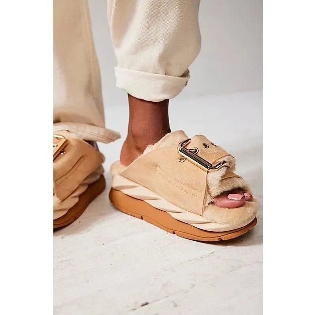 Make the most major statement with these slides from 4CCCCEES, featuring giant, oversized buckles on a shearling-lined sole for a comfy, head-turning addition to your shoe collection. **Features:** Slip-on style, backless design, suede uppers, genuine shearling lining, stacked platform EVA sole with tire-like tread, oversized buckle detailĀ