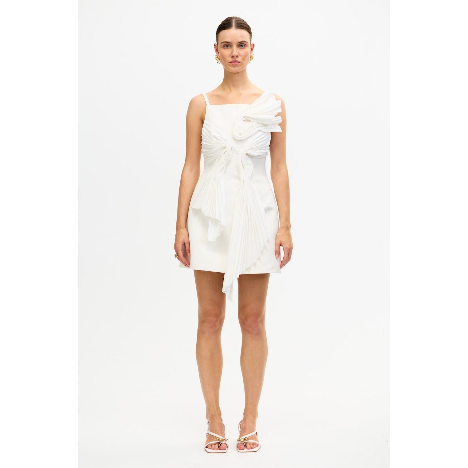 The Crowcombe Mini Dress in Ivory redefines modern femininity with its architecturally sculpted silhouette. Crafted from woven crepe de chine, this fully lined piece features sculptural pleated organza accents and a distinctive back D-ring strap-elements that create a refined sense of contrast and movement. An invisible centre-back zip ensures a seamless finish, perfect for elevated bridal styling or event dressing.