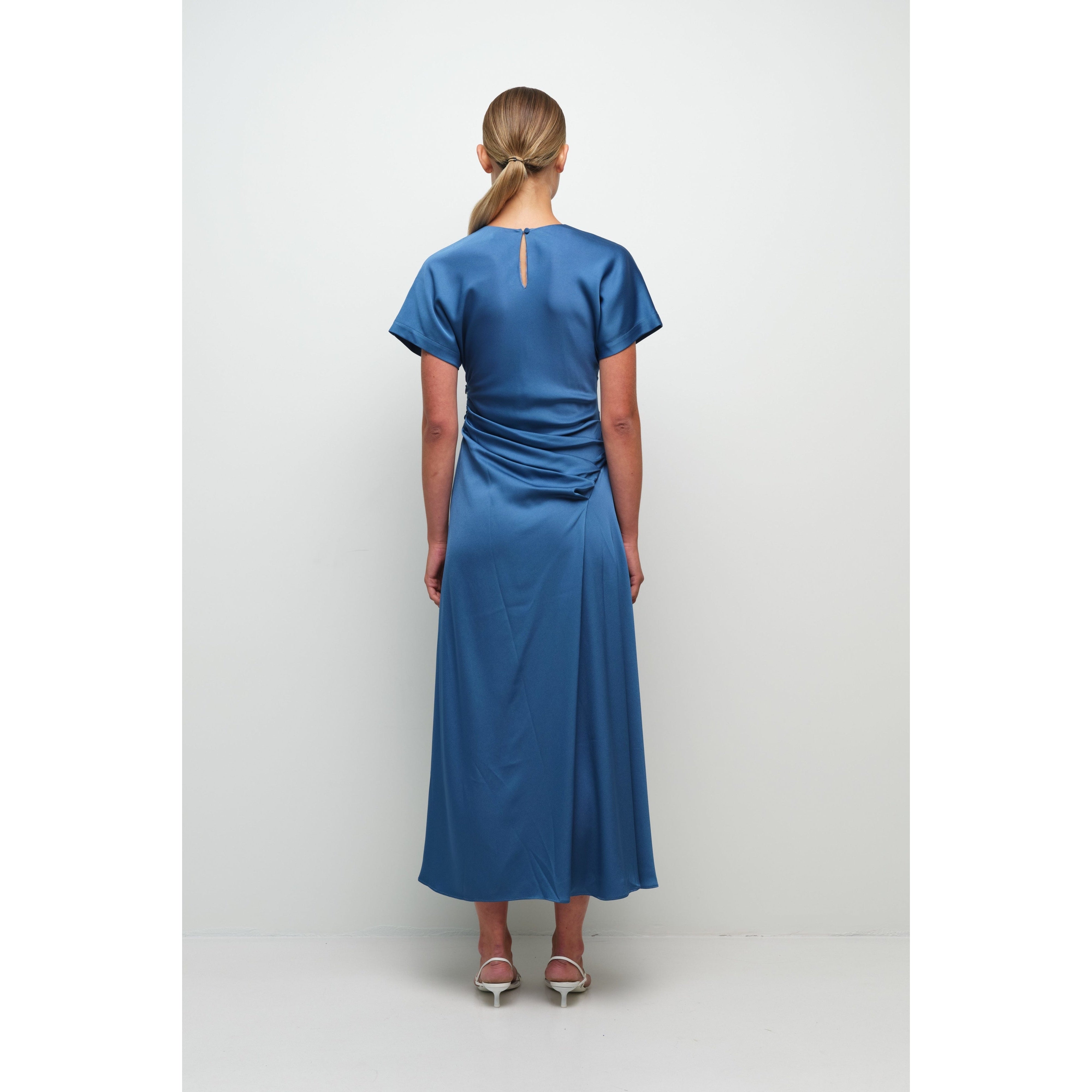 The Marabella Satin Midi Dress in Washed Indigo.This short-sleeve draped midi, crafted from classic woven satin features a refined silhouette with subtle ruching and a side slit for effortless elegance.