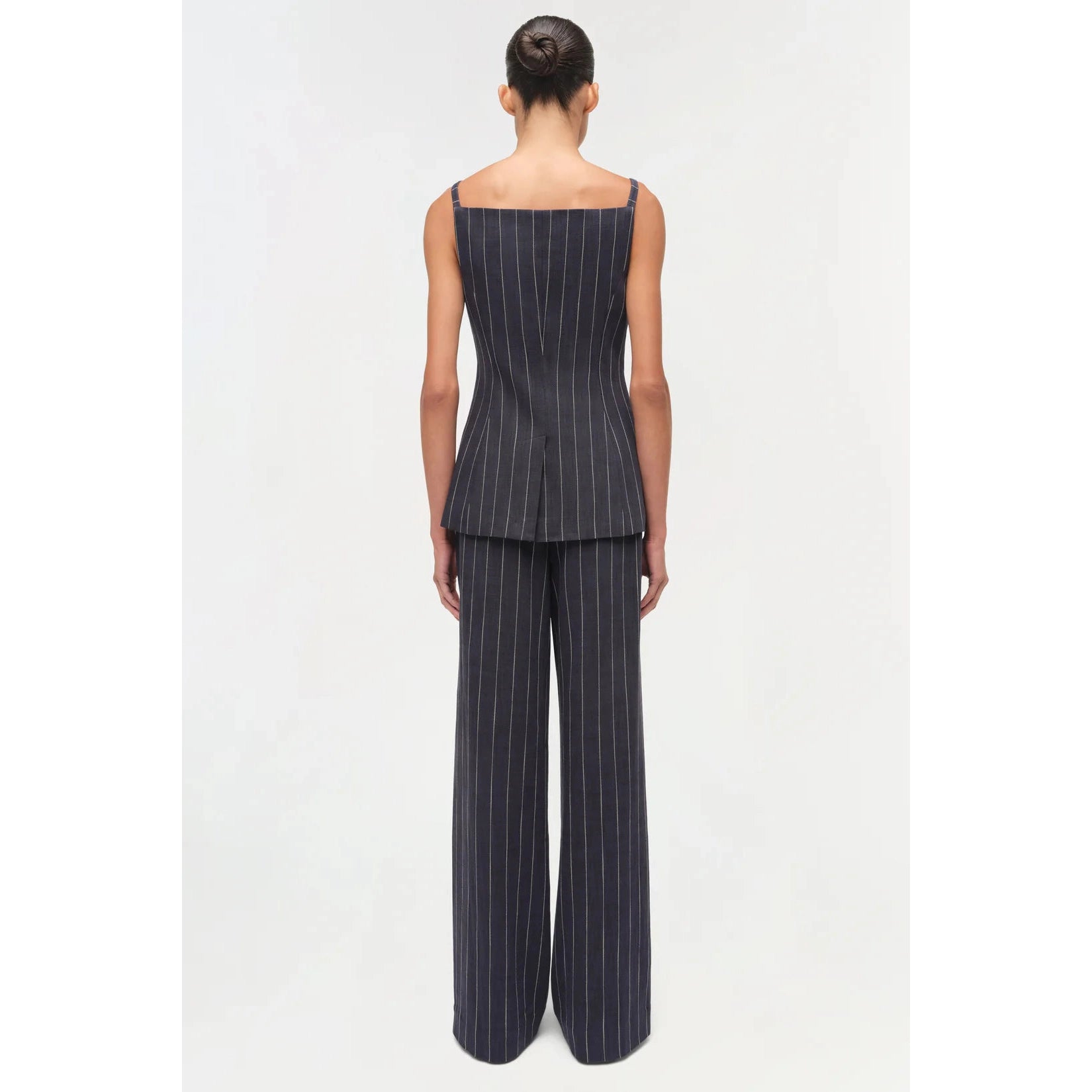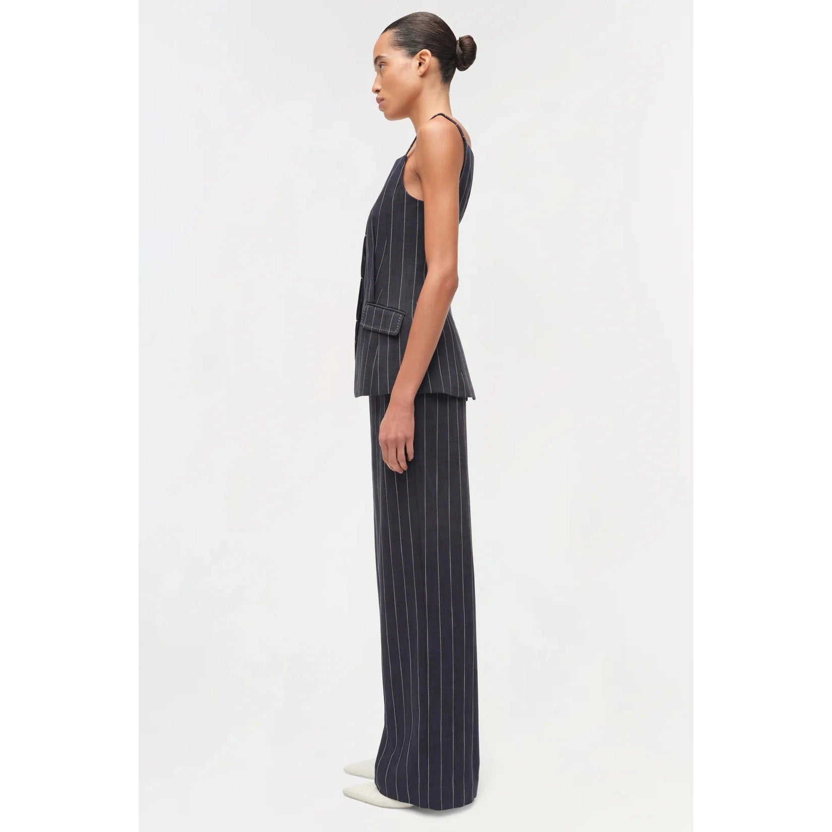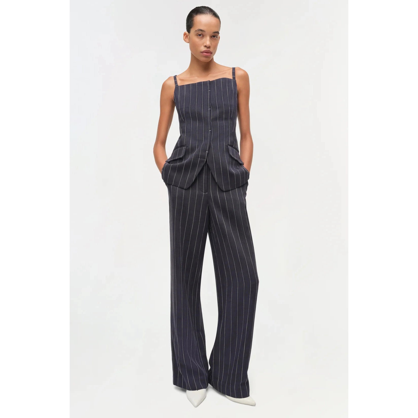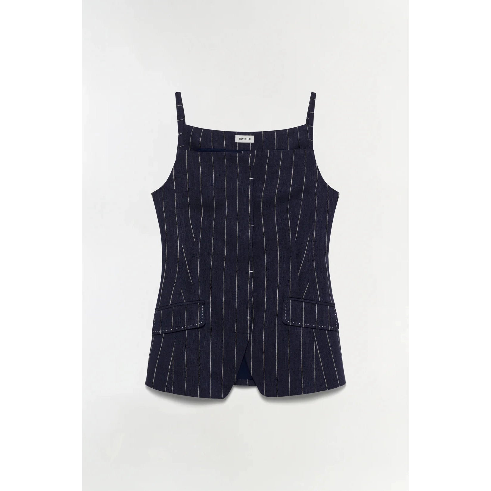 Cut in a fine pinstripe suiting, this top contours the body with precision seaming and a defined waist. The squared neckline and structured flap pockets lend a modern edge to a classic form.