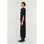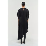 This satin mini dress is shaped with an artful drape, its cape-like sleeves cascading into an asymmetric hemline. A softly folded neckline frames the silhouette, adding a slight structure. Strikingly fluid the dress embodies modern glamour with an effortless sense of drama.