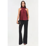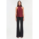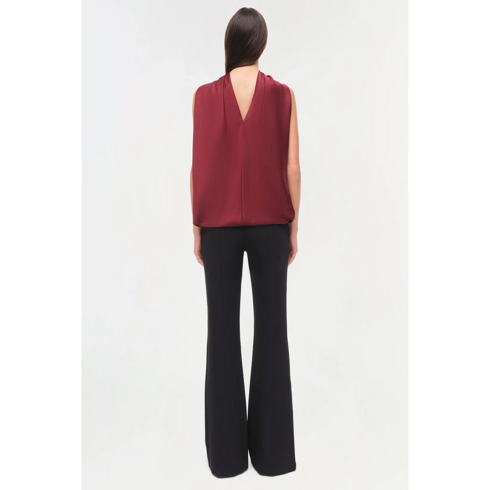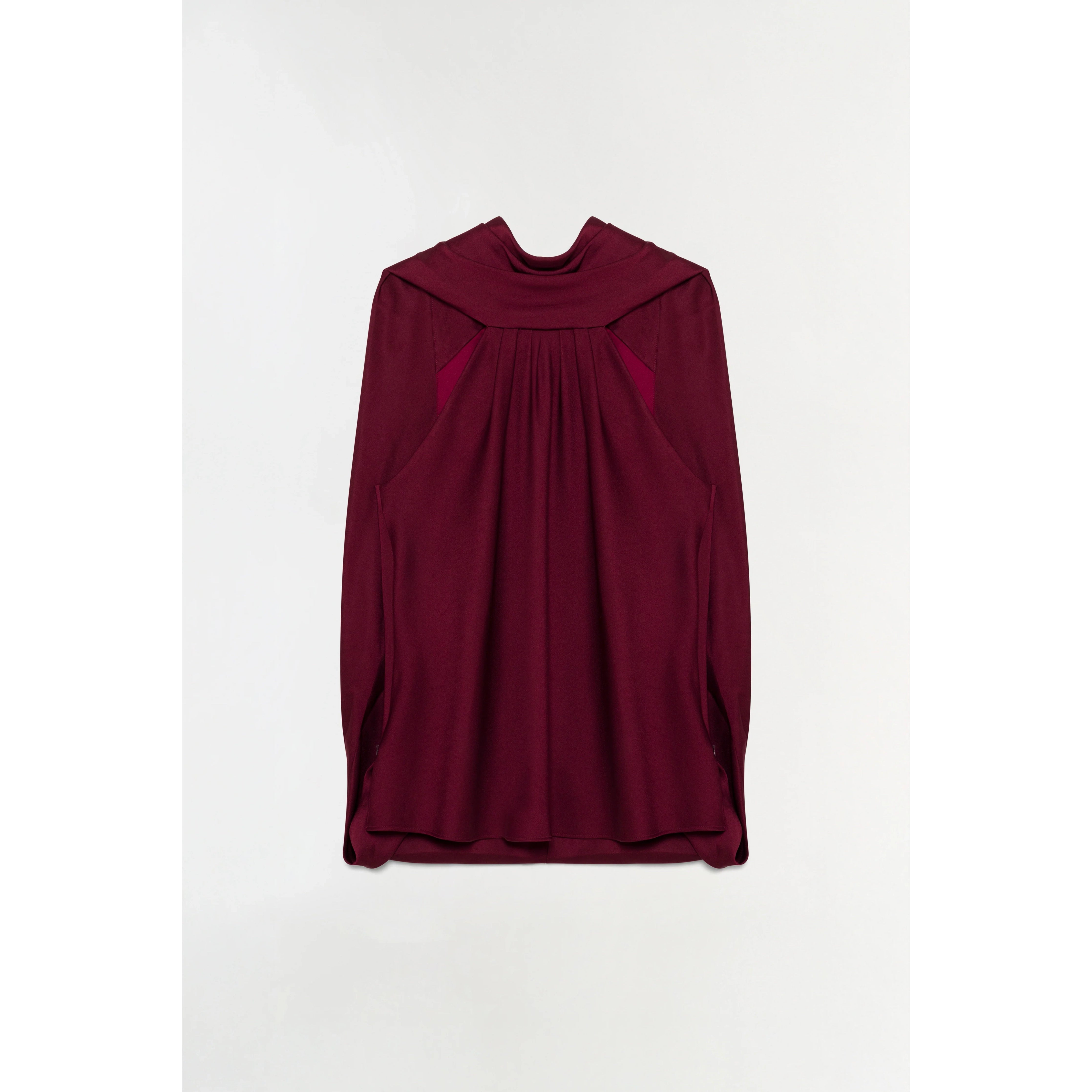 A draped satin cape top with a high neckline that gathers into controlled folds, releasing into a graceful back drape that falls with ease. Minimal yet striking, it captures the balance of movement and form.