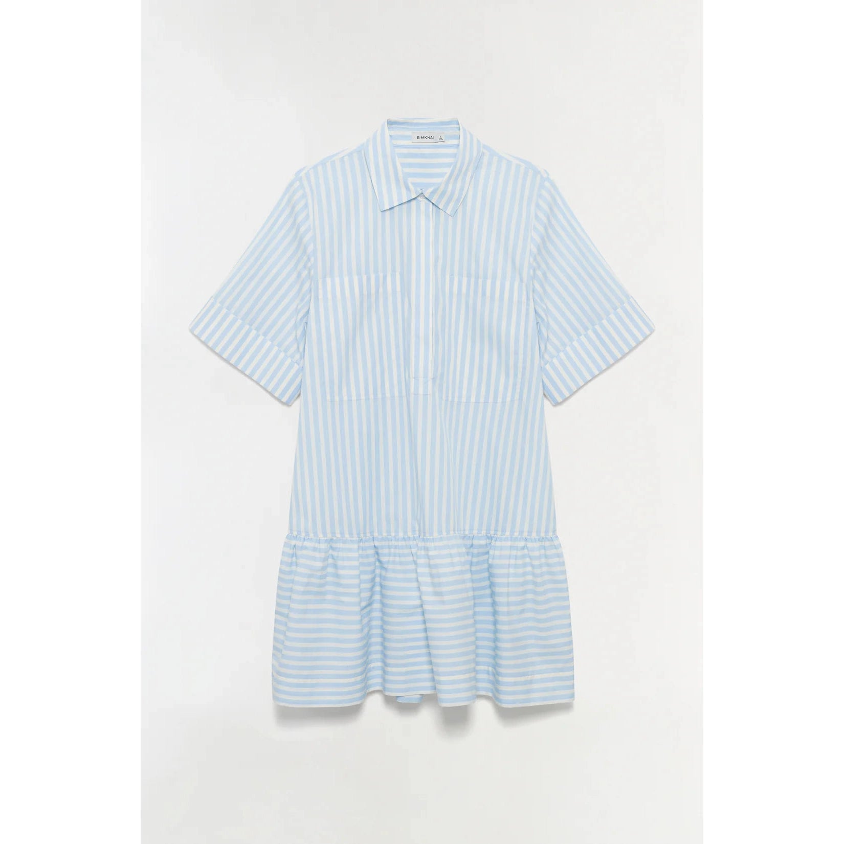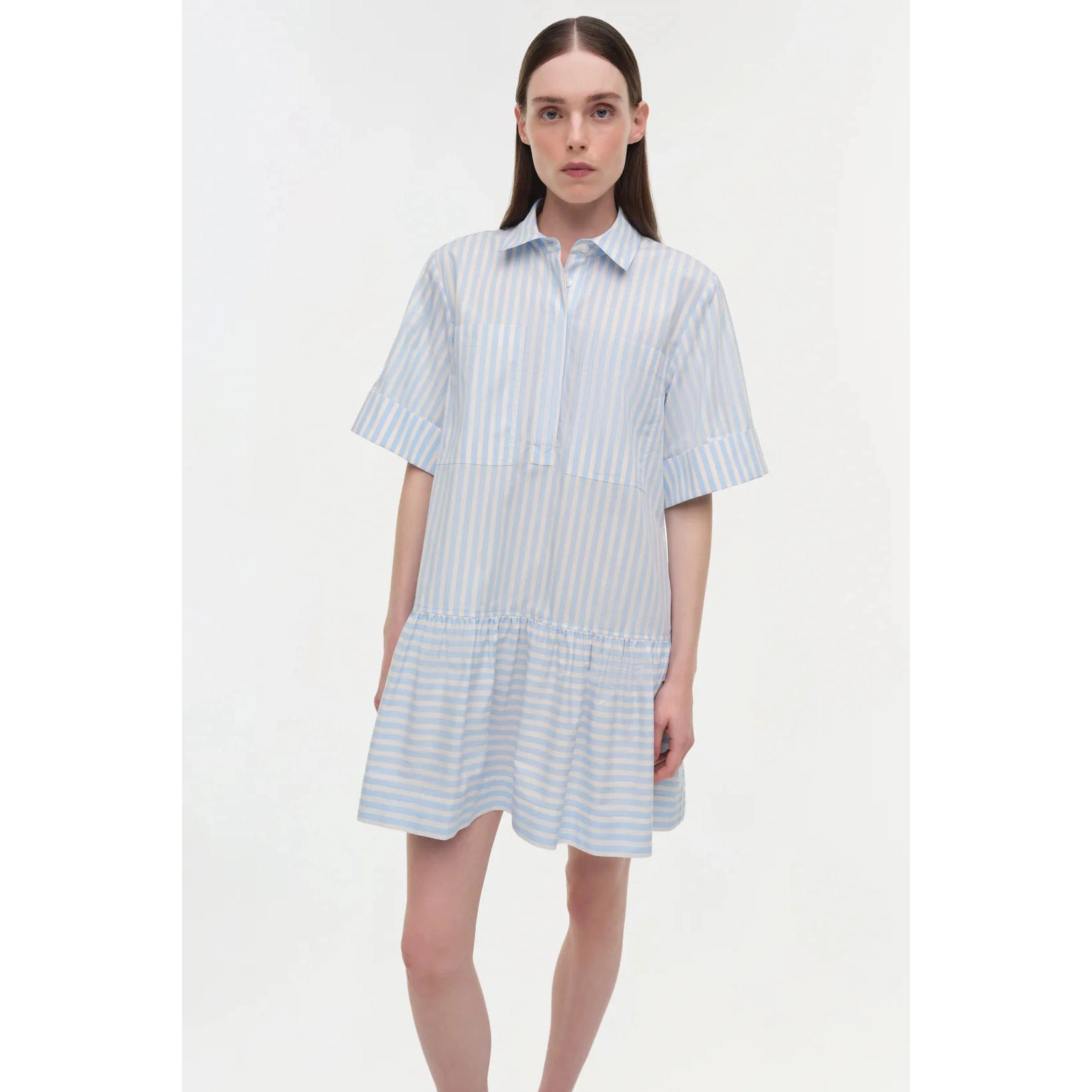 Crafted in breathable cotton poplin, this shirt dress features a straight neckline, wide short sleeves, and a neat half-placket. The shape opens into a lightly gathered skirt, offering gentle movement without losing structure. A simple, modern piece with a refined finish.
