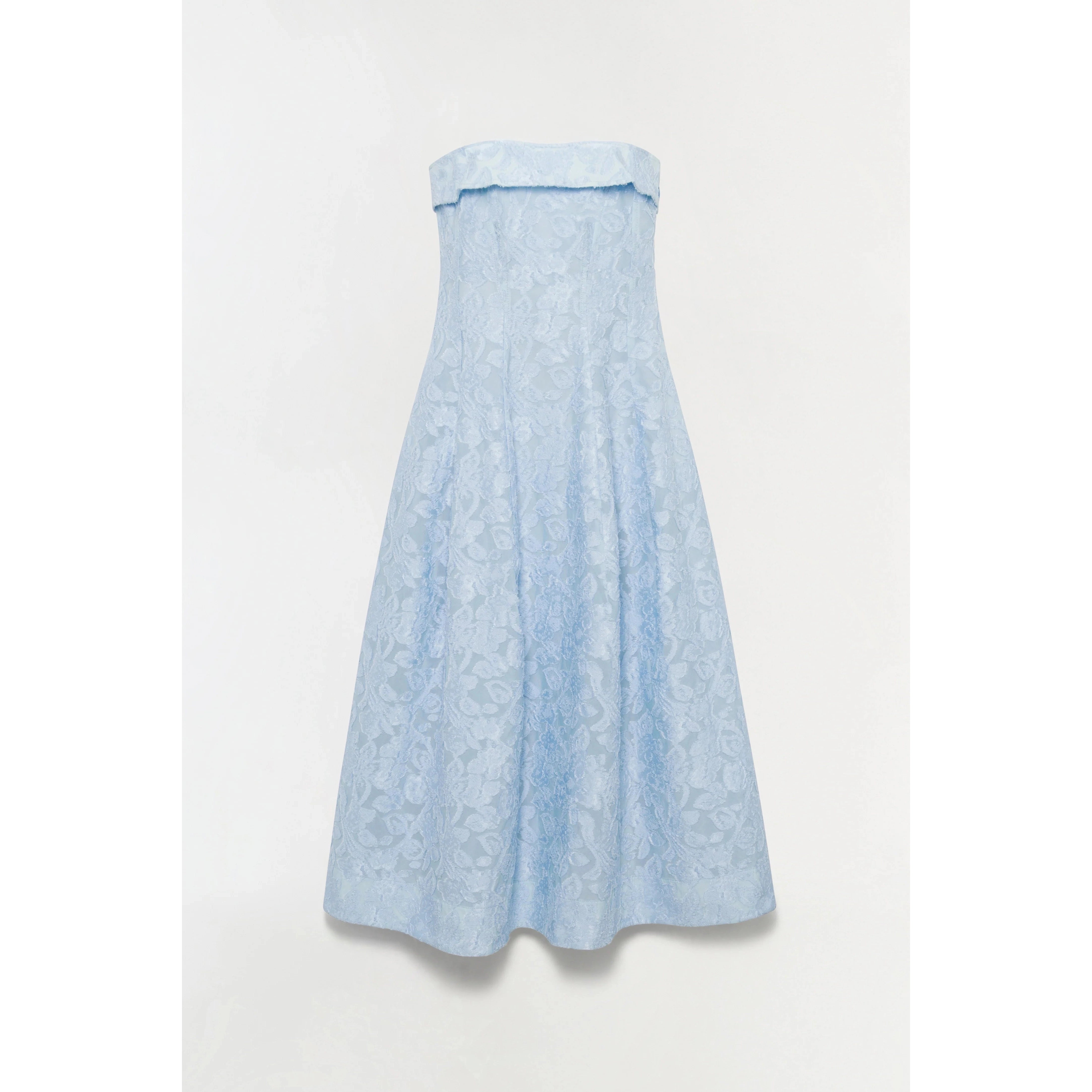 The Valeria Jacquard Midi Dress in Tidepool.This strapless dress features an exquisite sheer organza jacquard, creating a striking blend of texture and pattern. Its sculpted silhouette and detailed craftsmanship lend a timeless elegance and sophisticated appeal to the overall look.