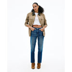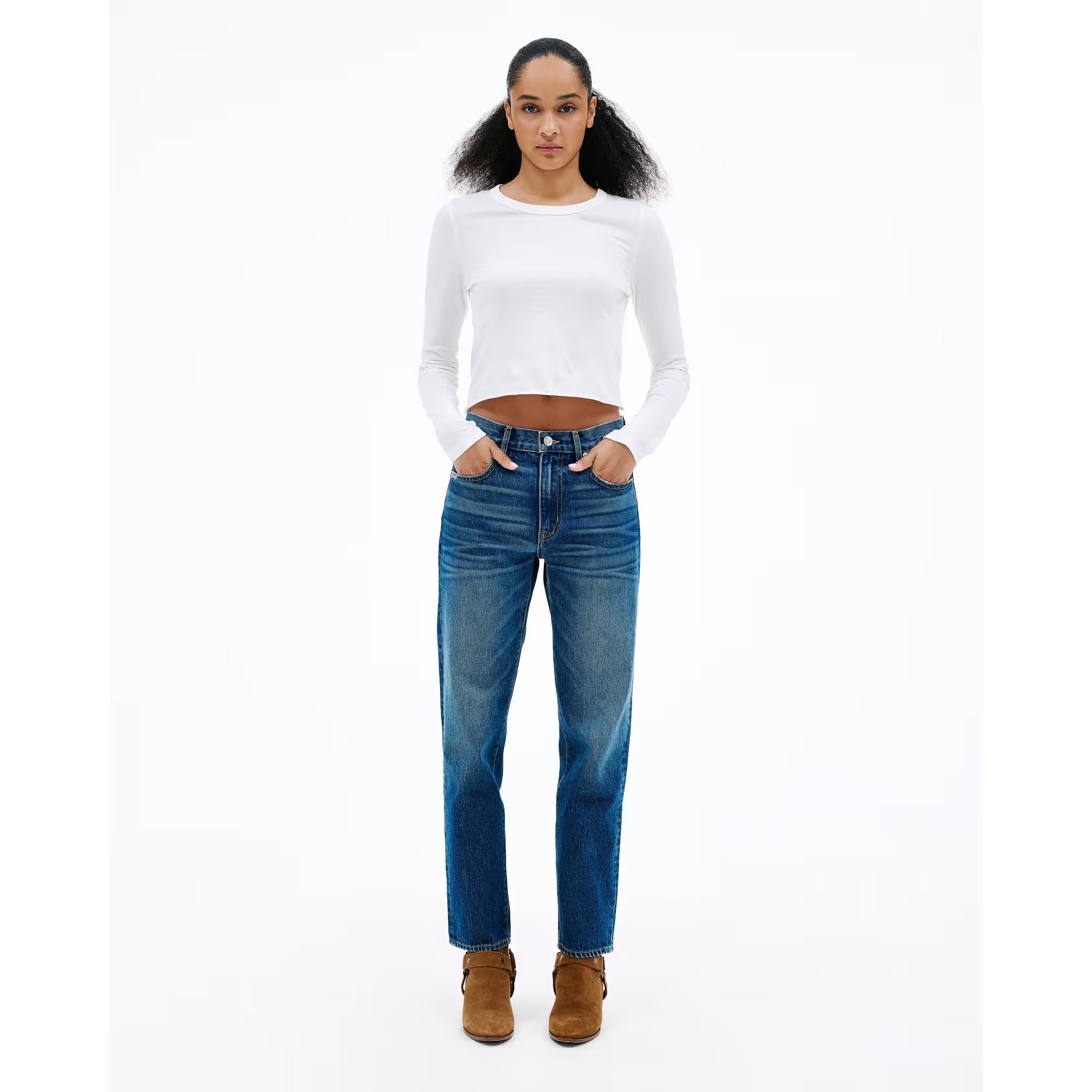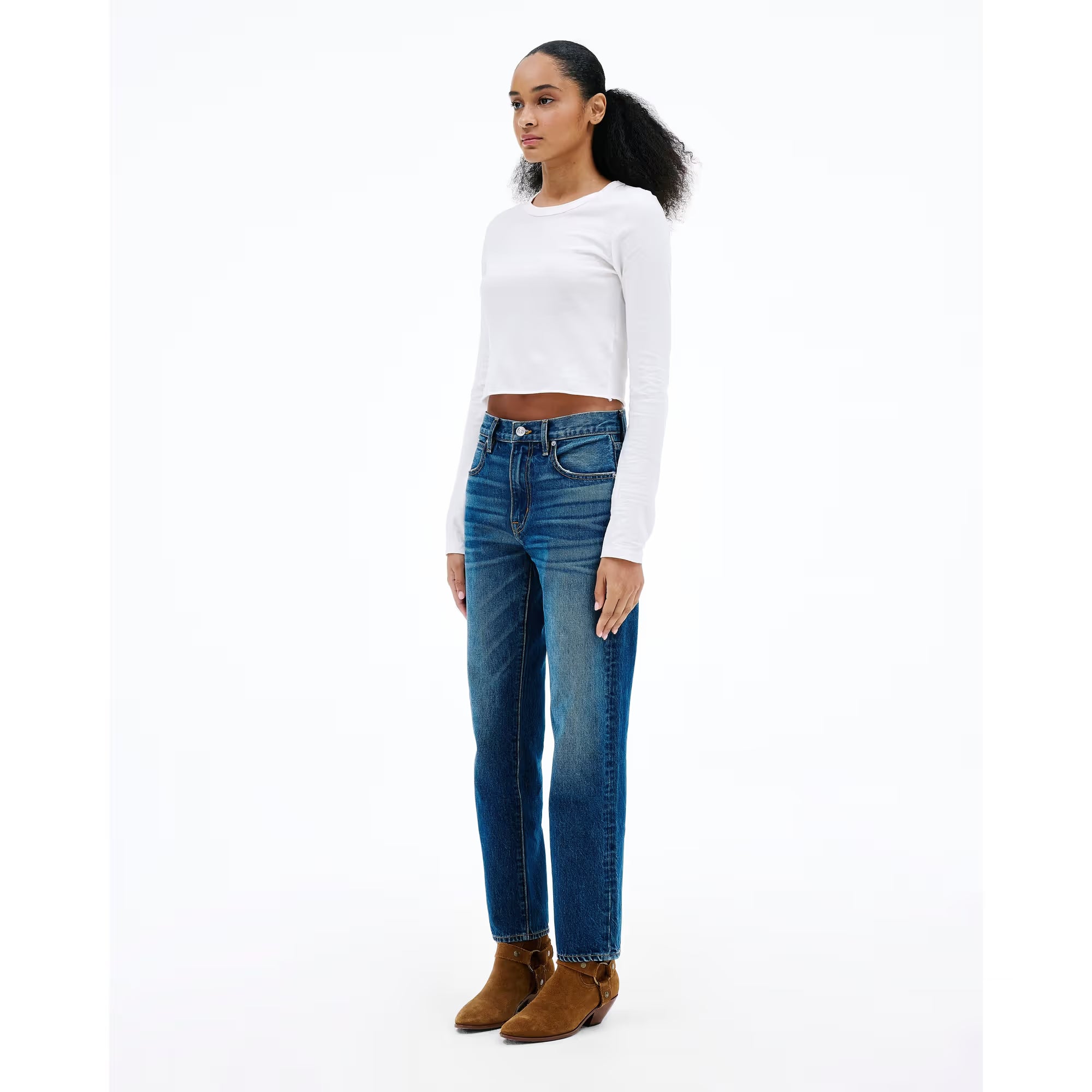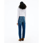 Amber is designed with a mid-rise and a slim silhouette, offering a flattering fit that elongates the legs for an effortless and timeless look.