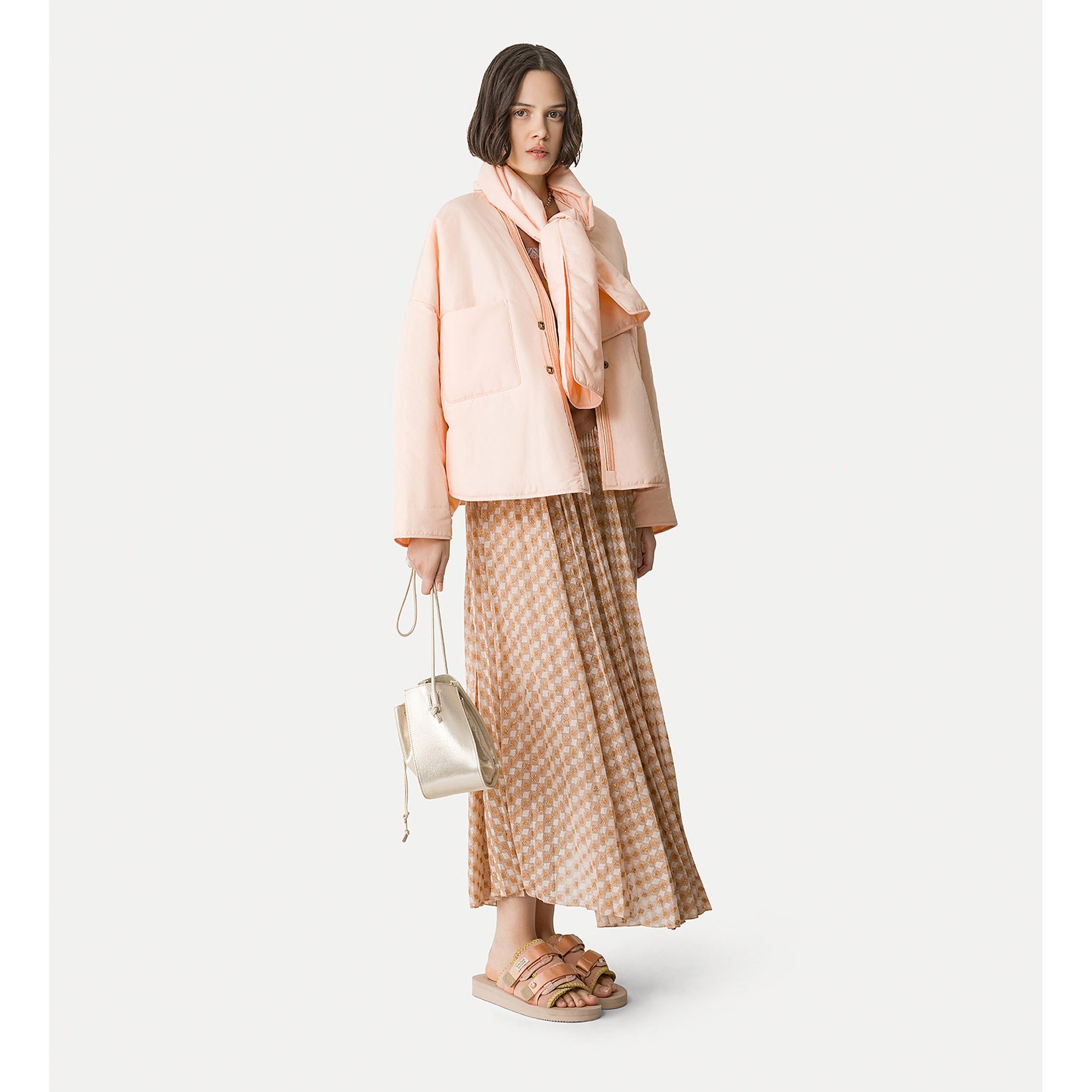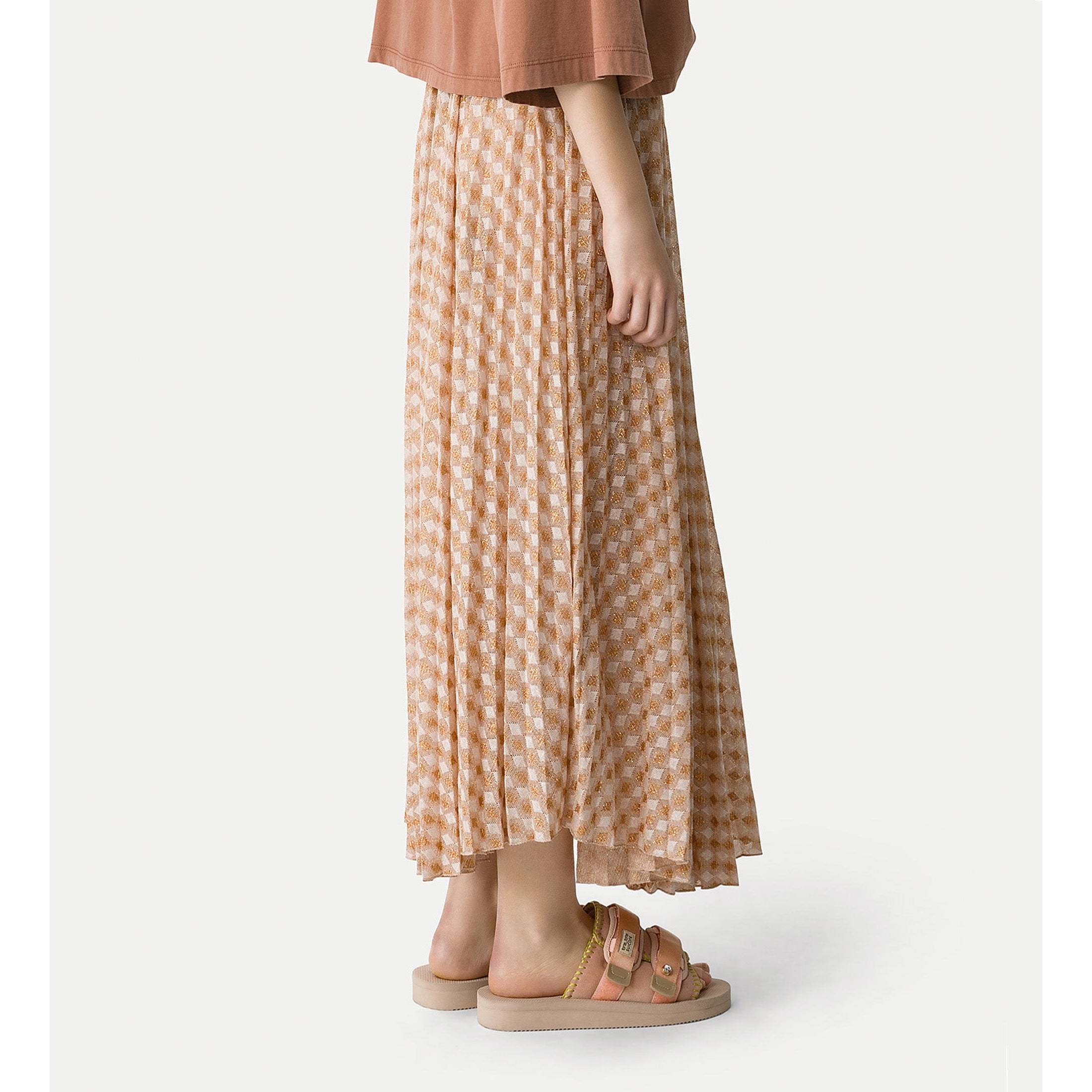 This pleated skirt in diamond jersey shimmers with a subtle lurex thread. the small elastic waistband and the flared volume at the hem play with the refined elegance of a soleil pleat.