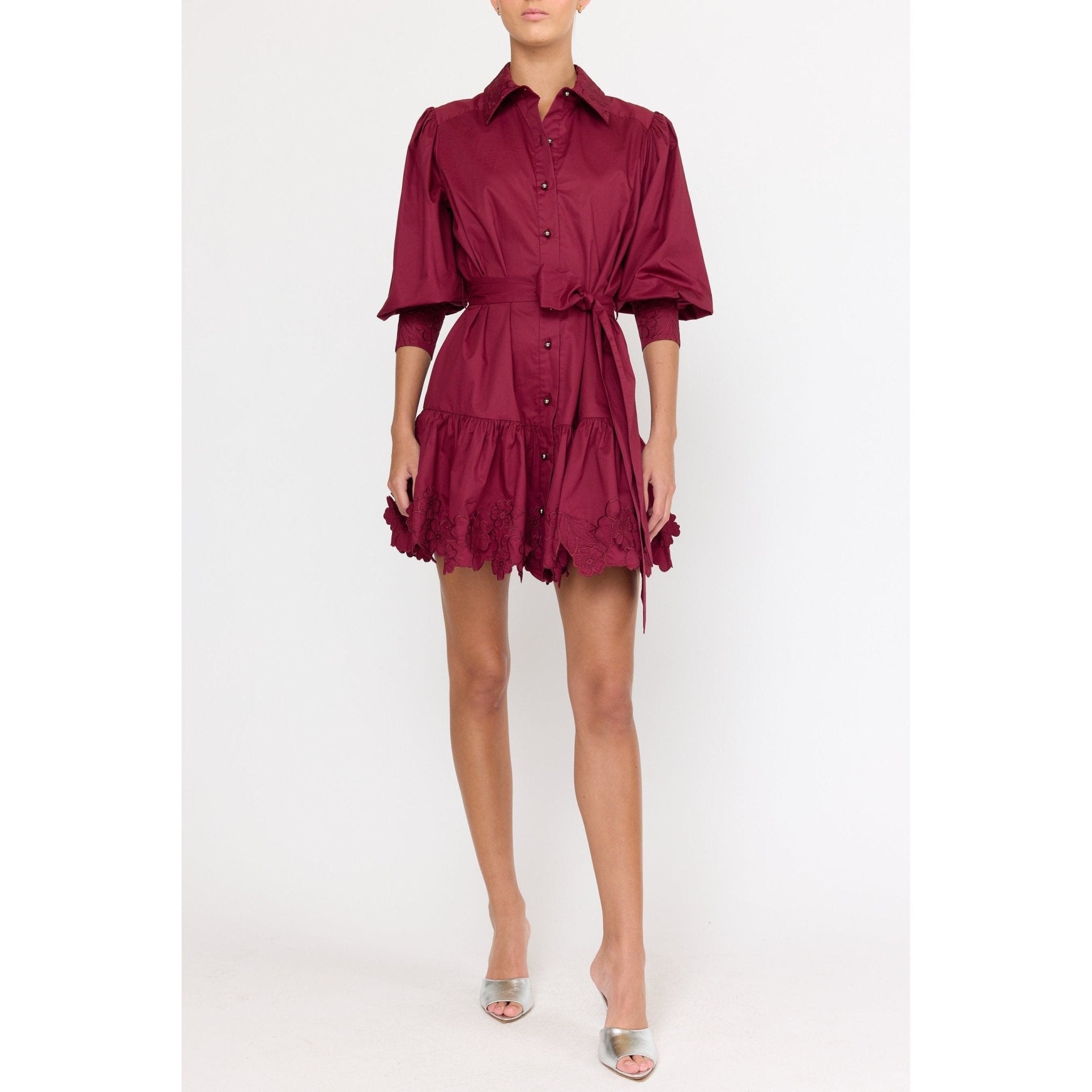The Norie Dress is a dependable classic body, but in a bold and striking maroon color. She features a sophisticated button design down the center placket with a pointed collar for a polished look. Its mid-thigh length and mid-arm bishop sleeves offer a balanced silhouette. The sash belt ties into a charming bow at the front, side, or back, allowing personalized styling. The dress is detailed with a laser-cut embroidered floral pattern on a ruffled hem, adding subtle texture and elegance to this piece.
