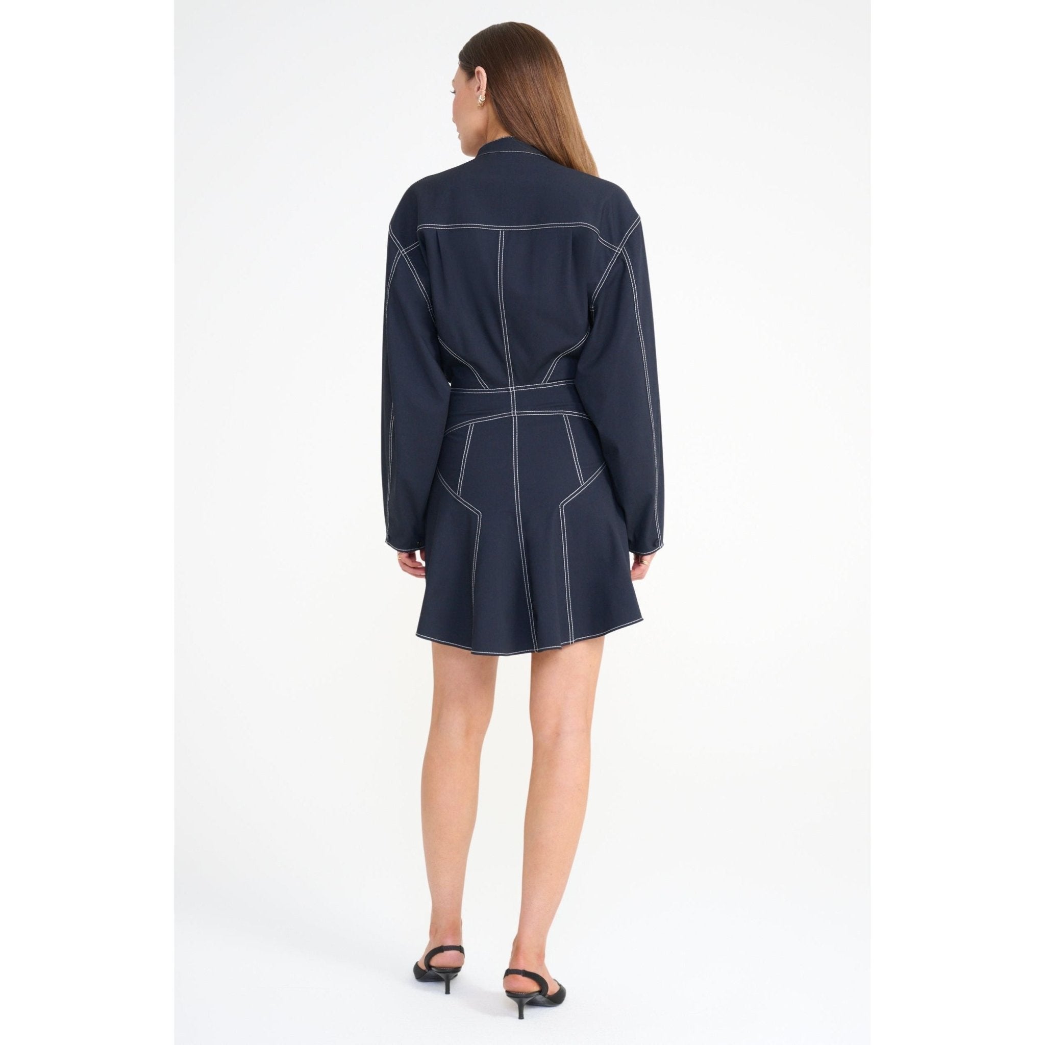 Staud's tailored Kiln shirtdress features contrast stitching, showcasing a band collar, dropped shoulders, and a yoke-style waist.