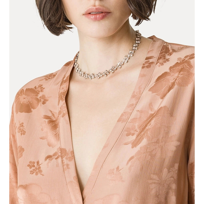 long—sleeved dress in a delicate jacquard fabric, enriched with tiny floral bouquets that seem to dance dreamily across the body. elegant, with a v neckline and a defined waist marked by a belt with trimmings and embedded crystals, the jacquard dress opens at the front with a deep slit, allowing for movement and graceful accessories.