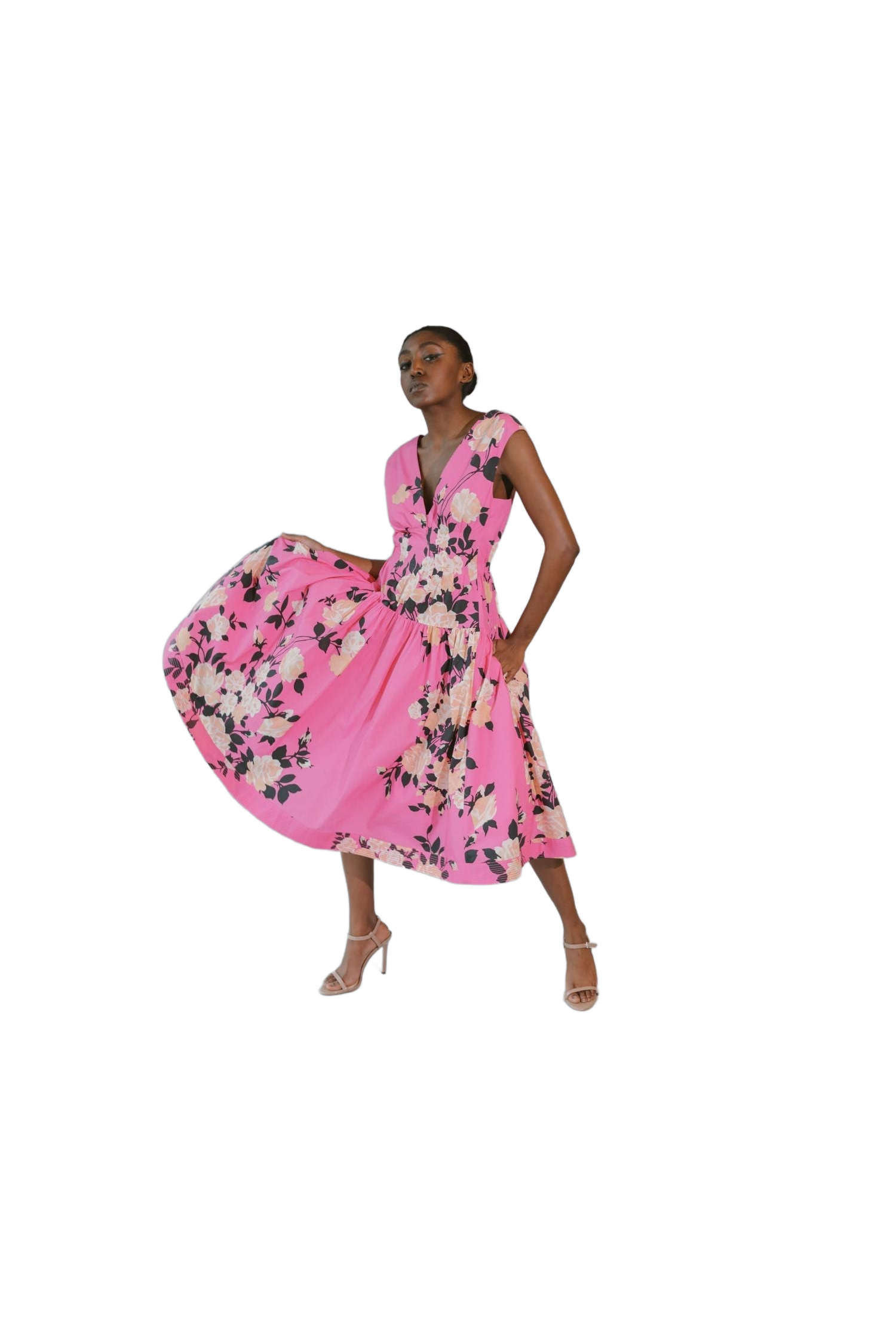 Our midi length, V-neck fit & flare dress has tucks at the waist that release under the bust. The full skirt has side seam pockets and a petticoat lining