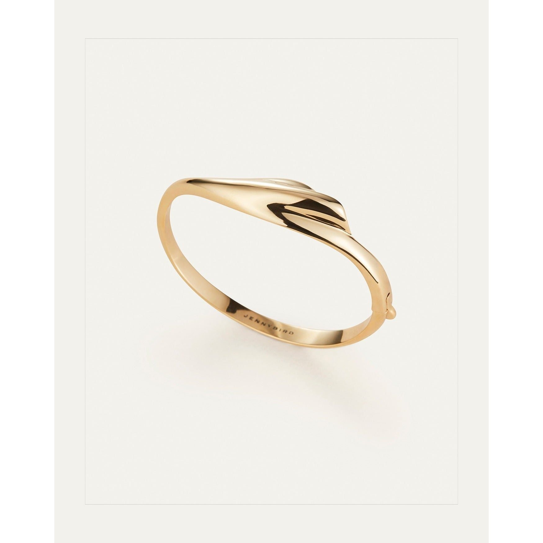 A light and lean bangle featuring a natural scalloped shell. It is water-durable, making it the perfect gold bracelet to mix into your wrist stack. This custom bangle opens and closes with a hinge and tab lock closure. To open, push down on the highest point of the clasp before pulling the bangle open. To close, listen for a "click" to ensure tab is locked properly. Finished in high-polish gold.