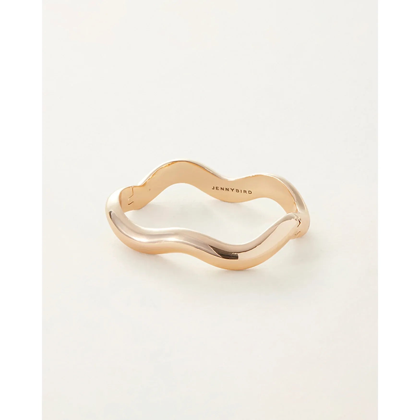 A bold, curvy bangle that makes a major statement. For double the curves, stack with another Ola Bangle, or mix in a silver version for a two-tone effect. This wavy bangle bracelet opens and closes with a hinge and tab lock closure. To open, push down on the highest point of the clasp before pulling the bangle open. To close, listen for a "click" to ensure tab is locked. Note: this design wears best when the closure is secured on the inside of your wrist. Finished in high-polish silver or gold.