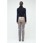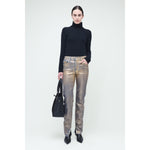 The Rae Denim in Matte Gold. High-rise ankle skinny bottoms with a sleek, form-fitting silhouette and high-shine finish that accentuates the figure.