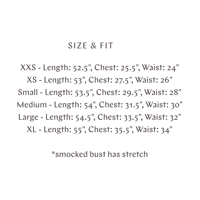 Both beautiful and practical, our Garden dress is a sophisticated throw on and go piece. Featuring wide straps, a contrast stitched smoked bodice and full length skirt. Additional features include pockets, wide-ruffle skirt hem, and small ruffle detail along the bodice.