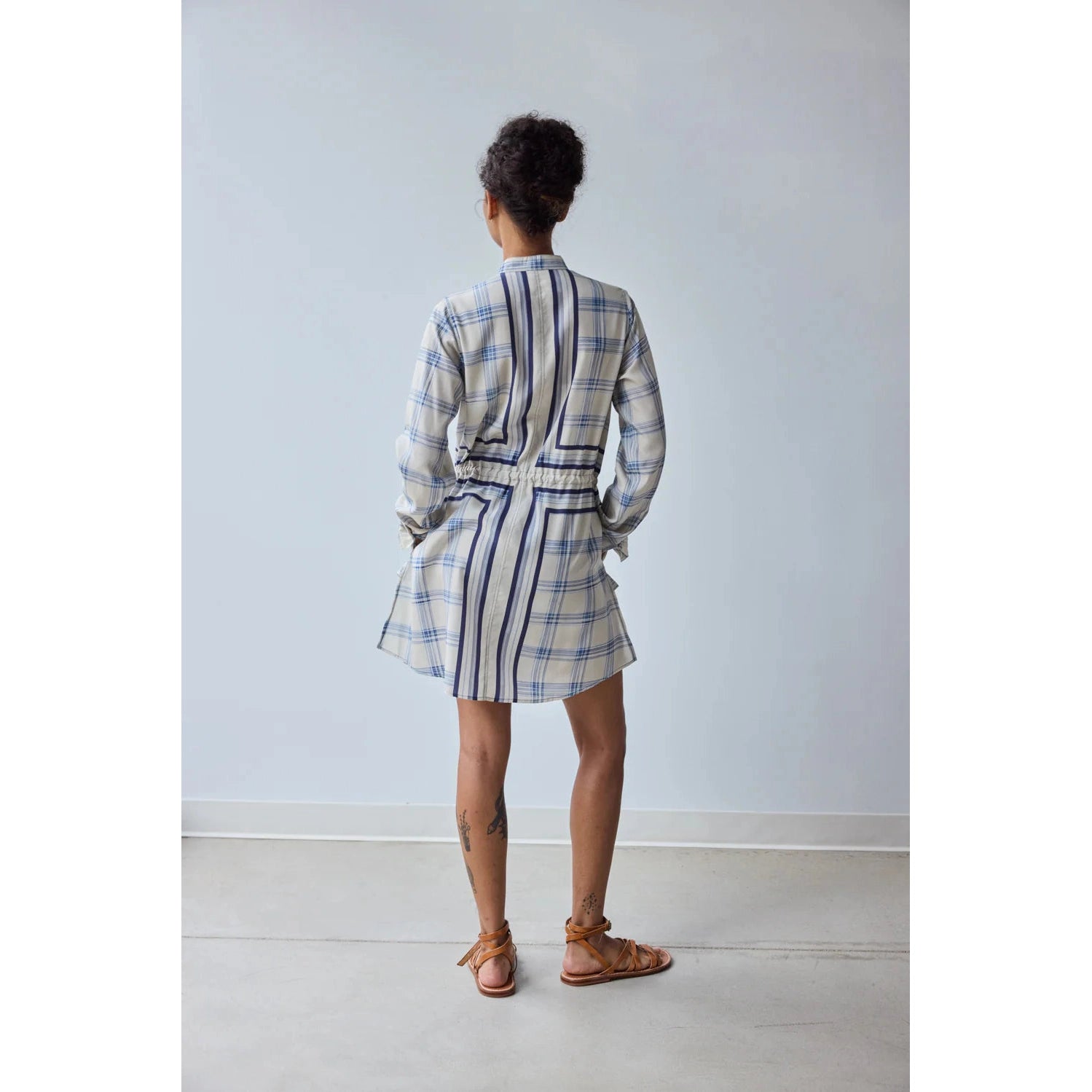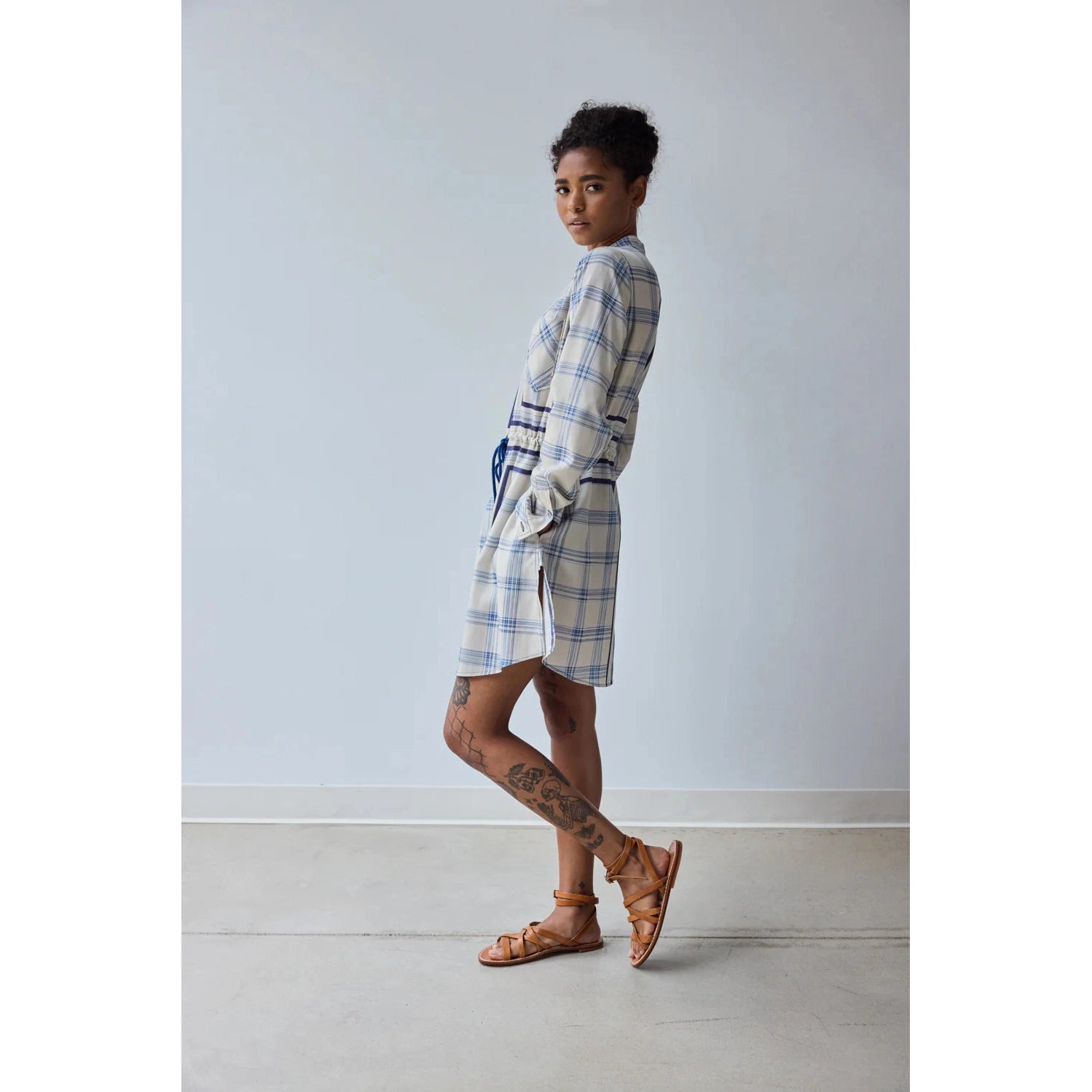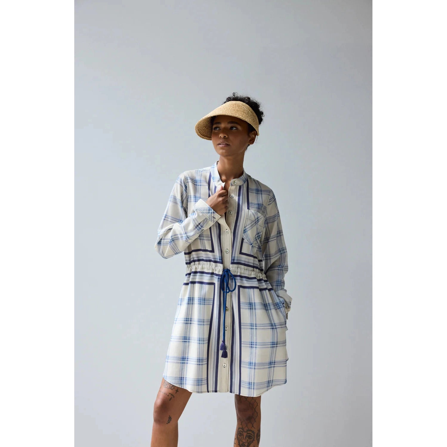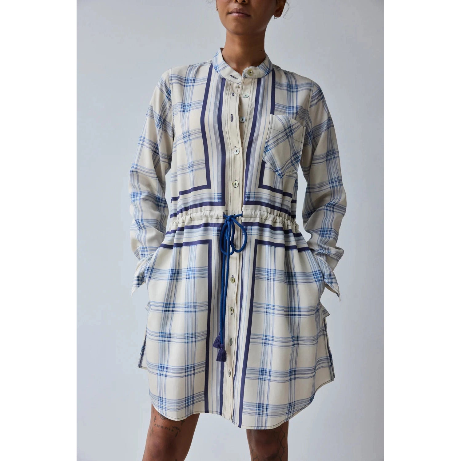 • Our band collar shirtdress in a mini button down version with border placements. It has full length sleeves, a drawstring waist and a shirttail hem. Side seam pockets and side slits.