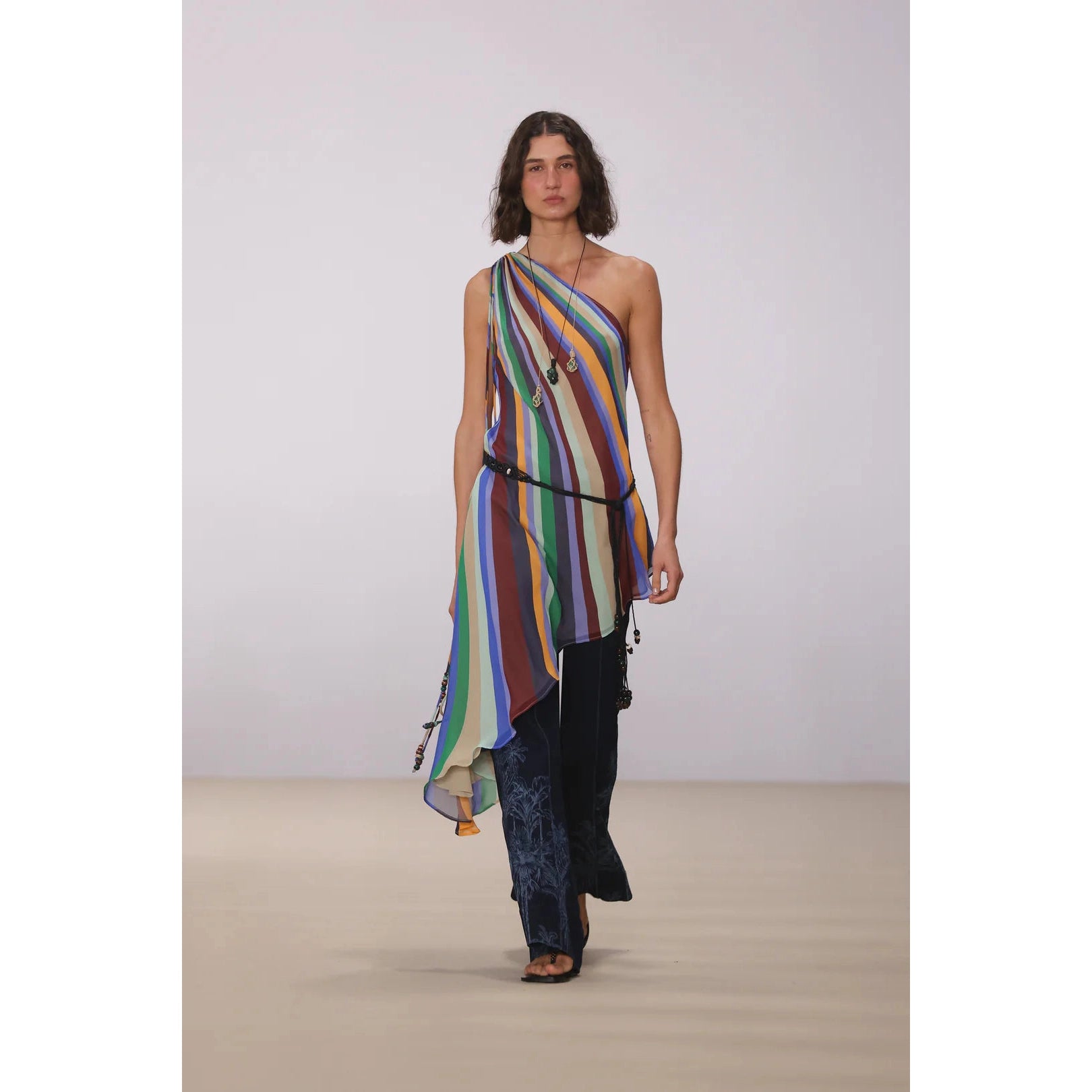 The Lumi Silk Dress is crafted from luxe silk in an exclusive Hansen placement-printed stripe. Featuring a drawstring at the shoulder, beaded tassel details, and an asymmetrical hem, the Lumi can be styled and layered as a top or stand out on it's own as a dress.