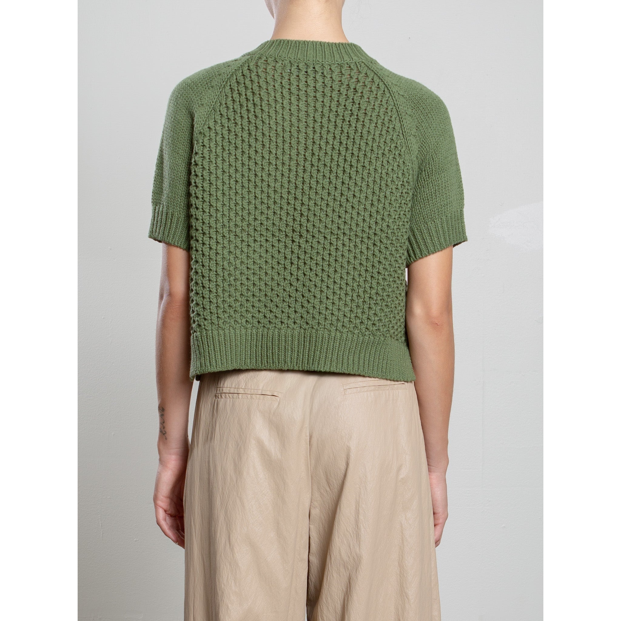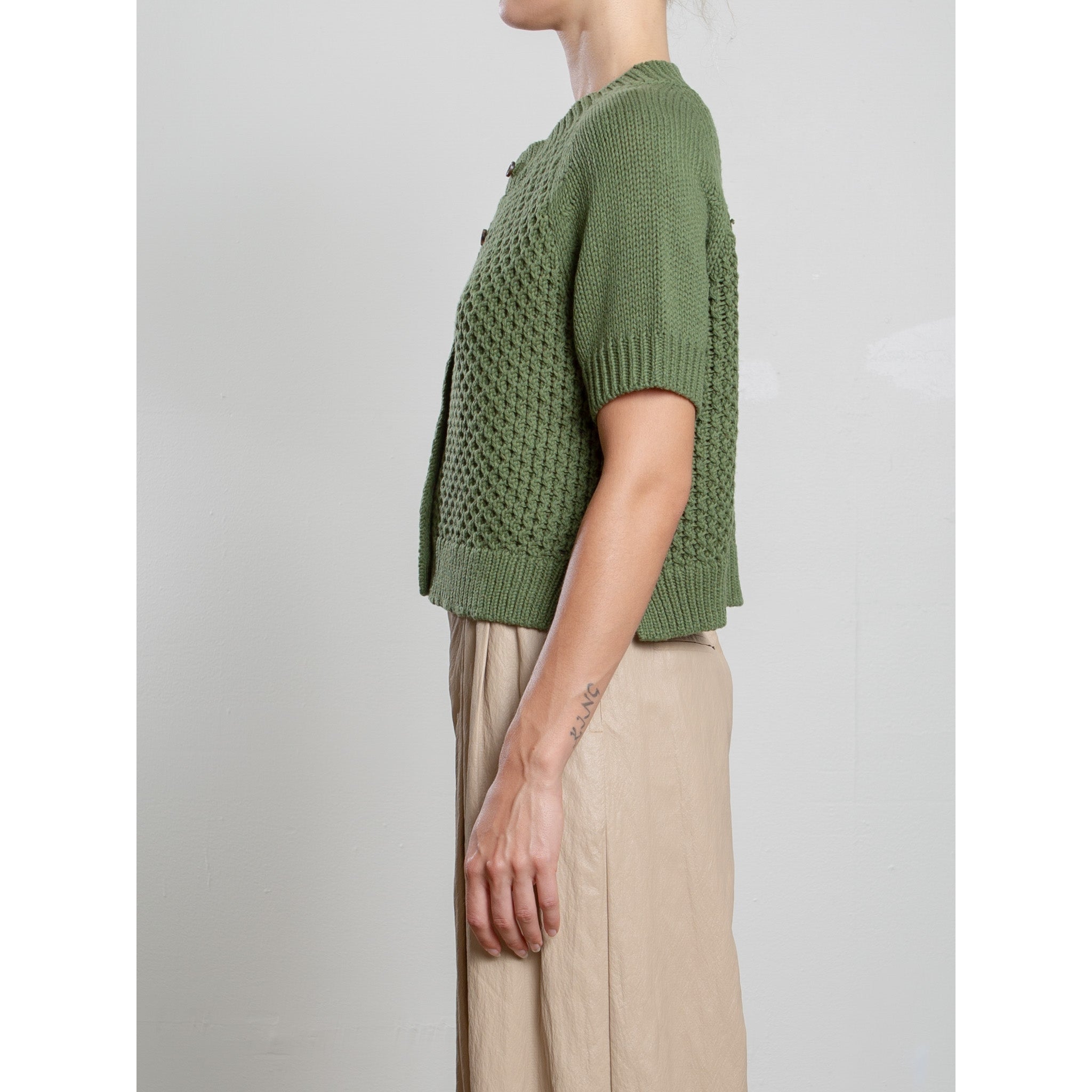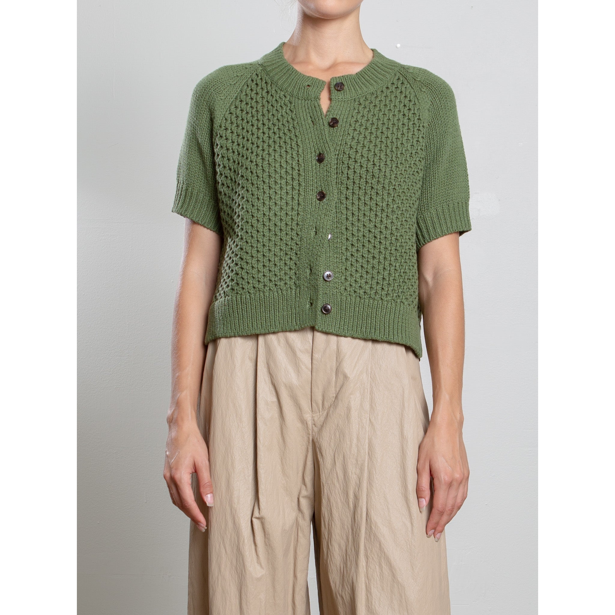 Short sleeve cardigan with chunky stitch.
