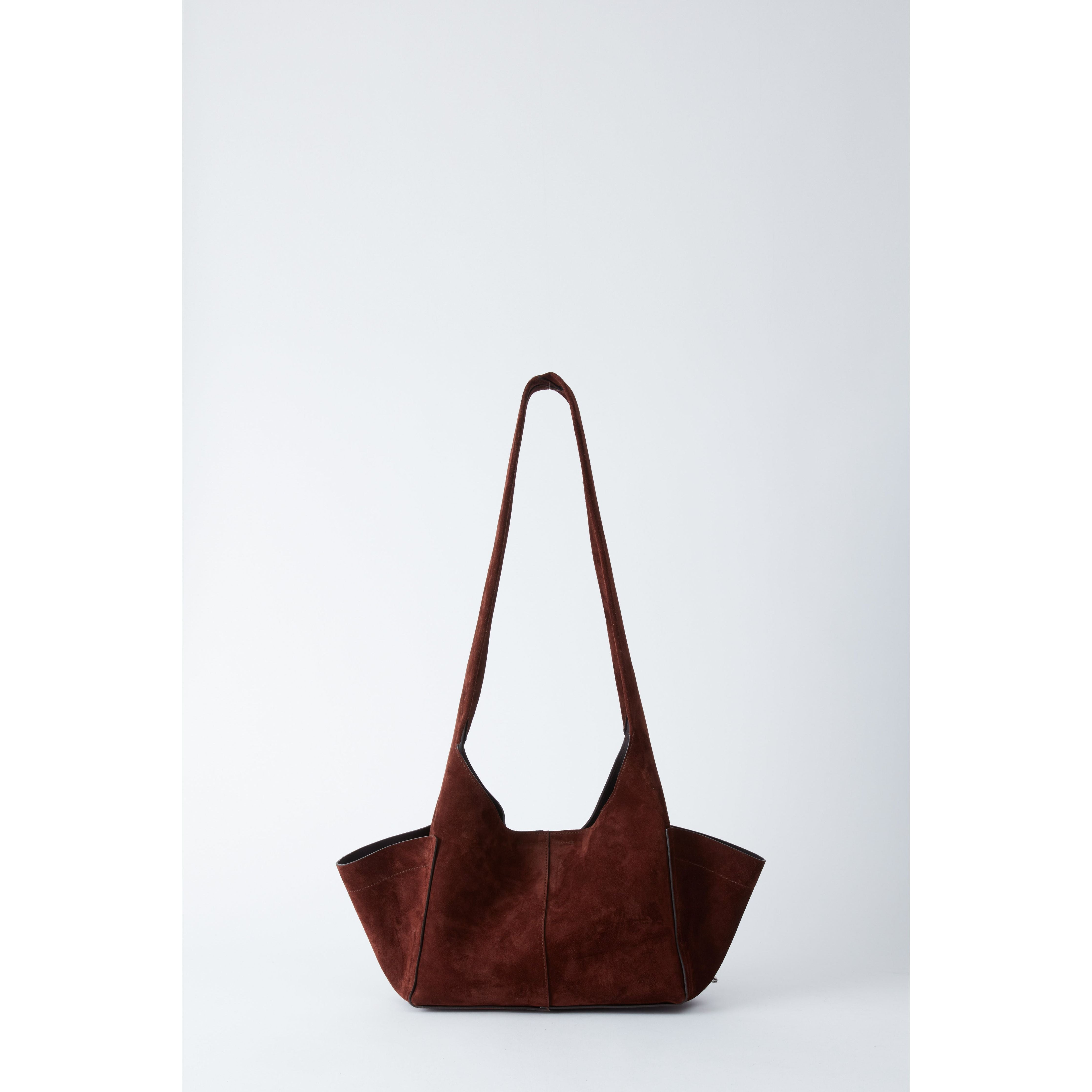 Soft and sculptural, this semi-structured bag in rich bonded suede features a fixed shoulder strap, extended exterior pockets, and magnetic closure. Can be worn over the shoulder or across the body. A smaller version of our Large Tool Bag.