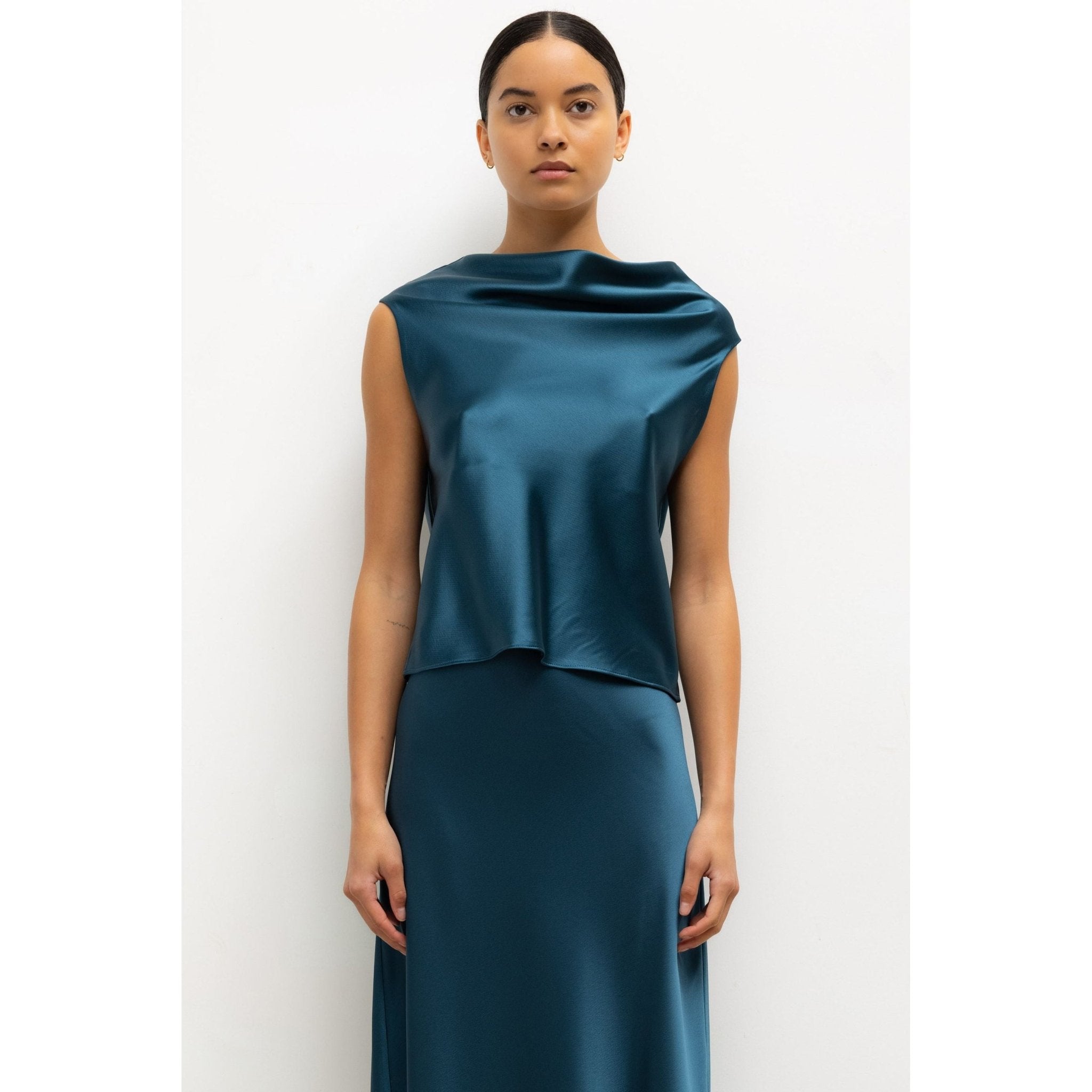 Cut in our best-selling, Japanese-crafted Barb Satin, The Barb Shell is a sleeveless top featuring twisted asymmetrical shoulders that drape perfectly. Make it a matching set with any Barb bottom
