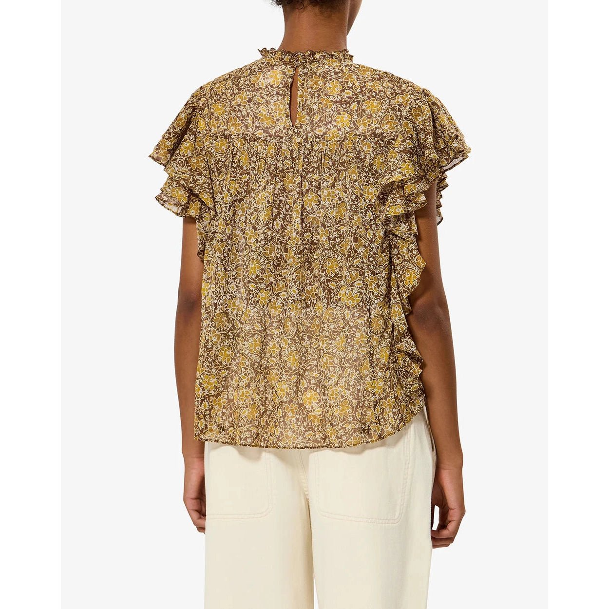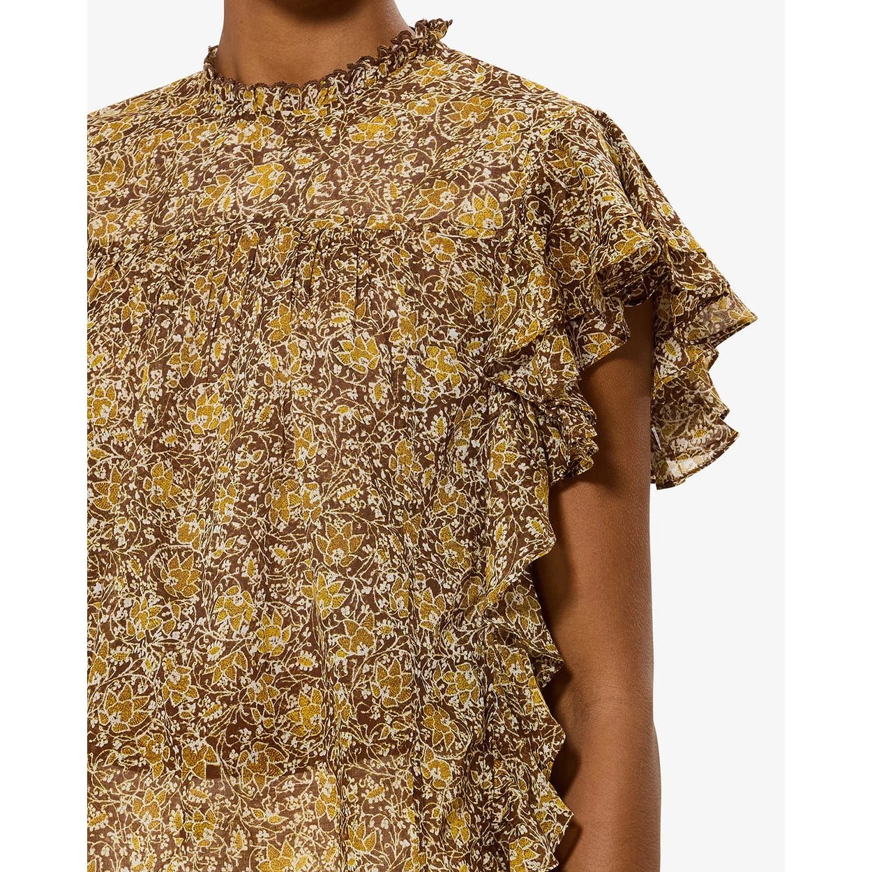 Sleeveless cotton voile blouseRound neckline with gathered finishesGathered pleated front and shoulder details