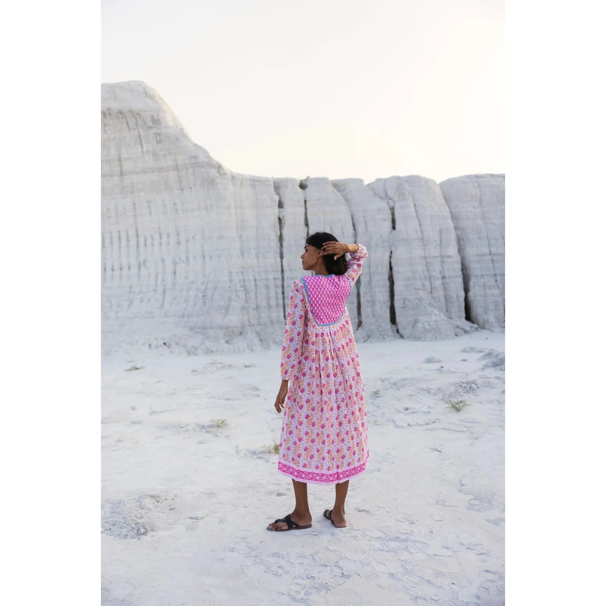 The Kitty Dress is an original SZ Blockprints style. An easy loose body with a hem that falls to mid-calf and a contrast bib.