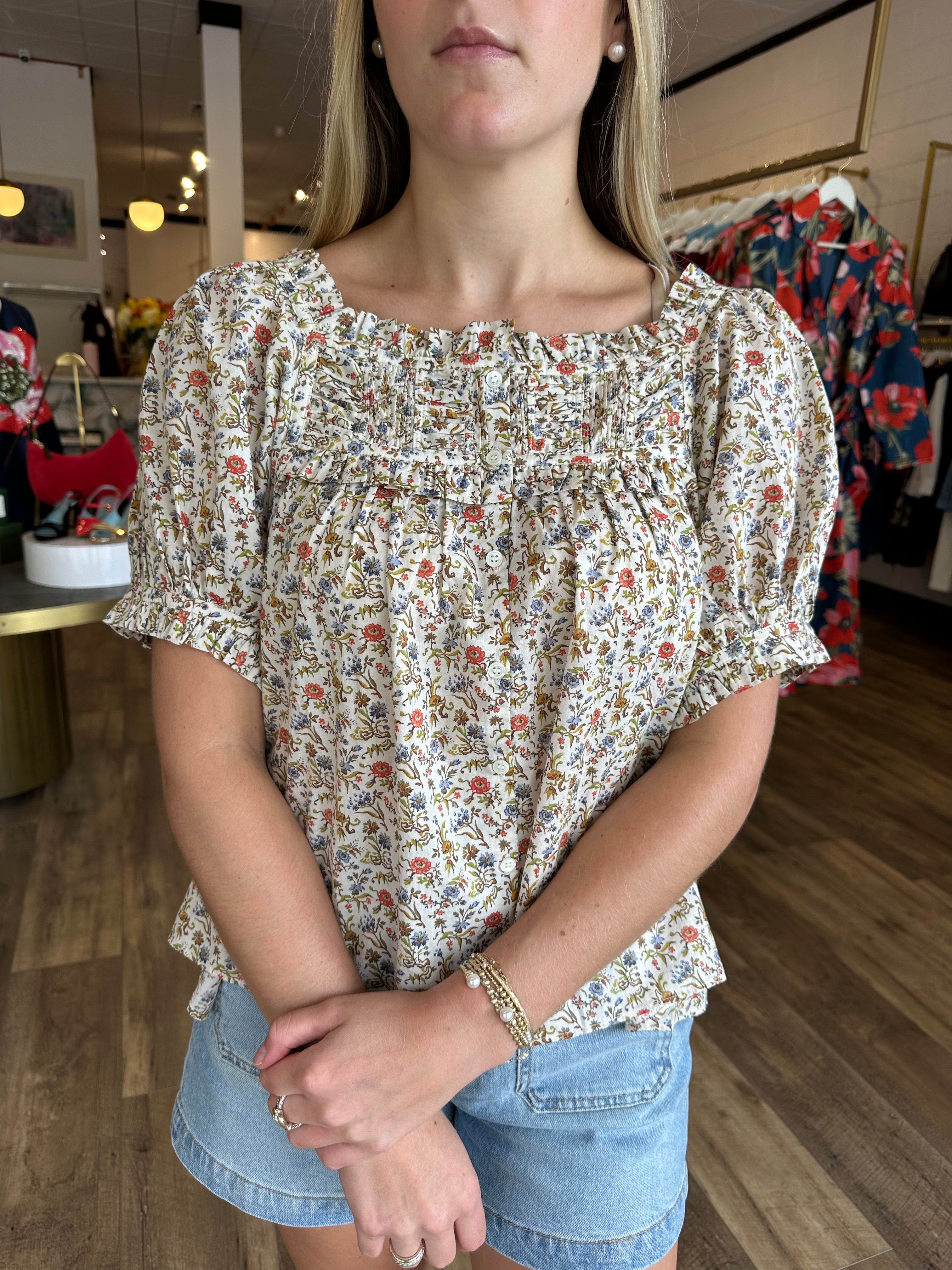 Crafted from a soft, organic cotton lawn adorned with our antique-inspired Jardin du Château print, the Farley Top features a breezy silhouette with a square neckline and short puffed sleeves trimmed with petite ruffles. The square yoke is detailed with alternating panels of pintucks and ruching, while mother-of-pearl buttons extend down the front. Wear it loose, or tuck it into your favorite high-waisted shorts.