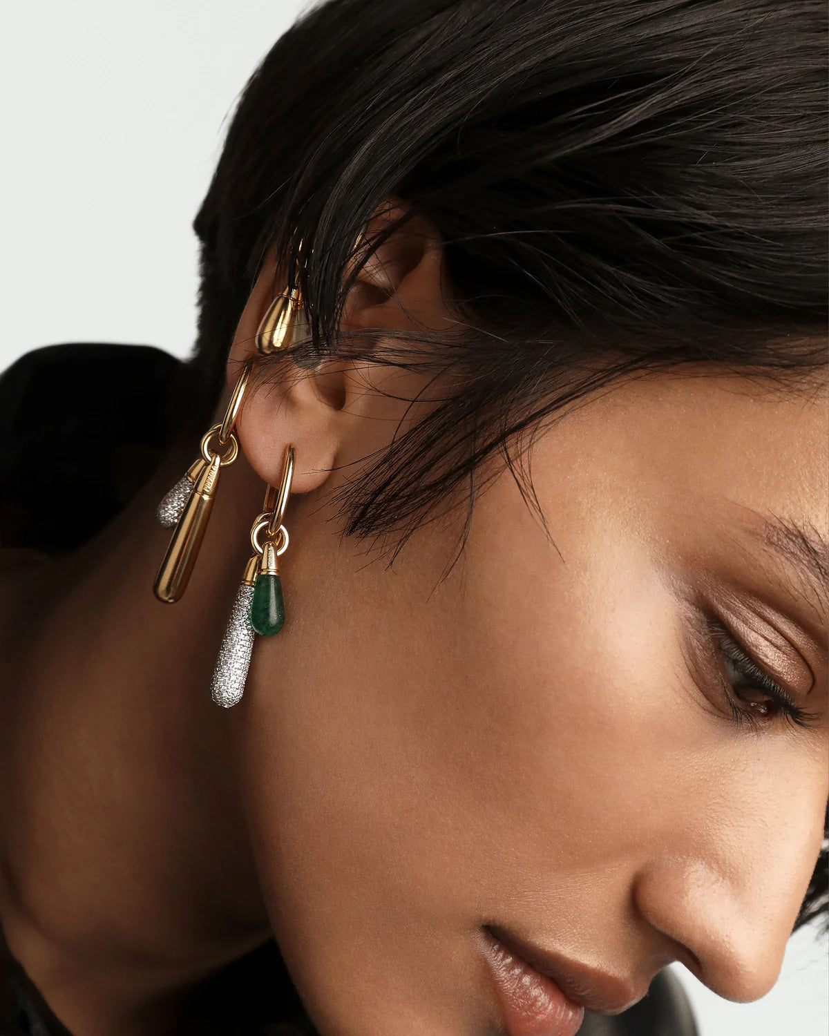 The Icons speak to your individuality and celebrate the art of personalization. Featuring distinctive drop shaped natural gemstones like labradorite and aventurine as well as hand-set pavé, these pieces are the perfect blend of design and craftsmanship. At the core of the collection lies the Drop pendants, a canvas for creativity to stack on hoops or necklaces. Embrace an ever-changing collection and unlock a new jewelry language.