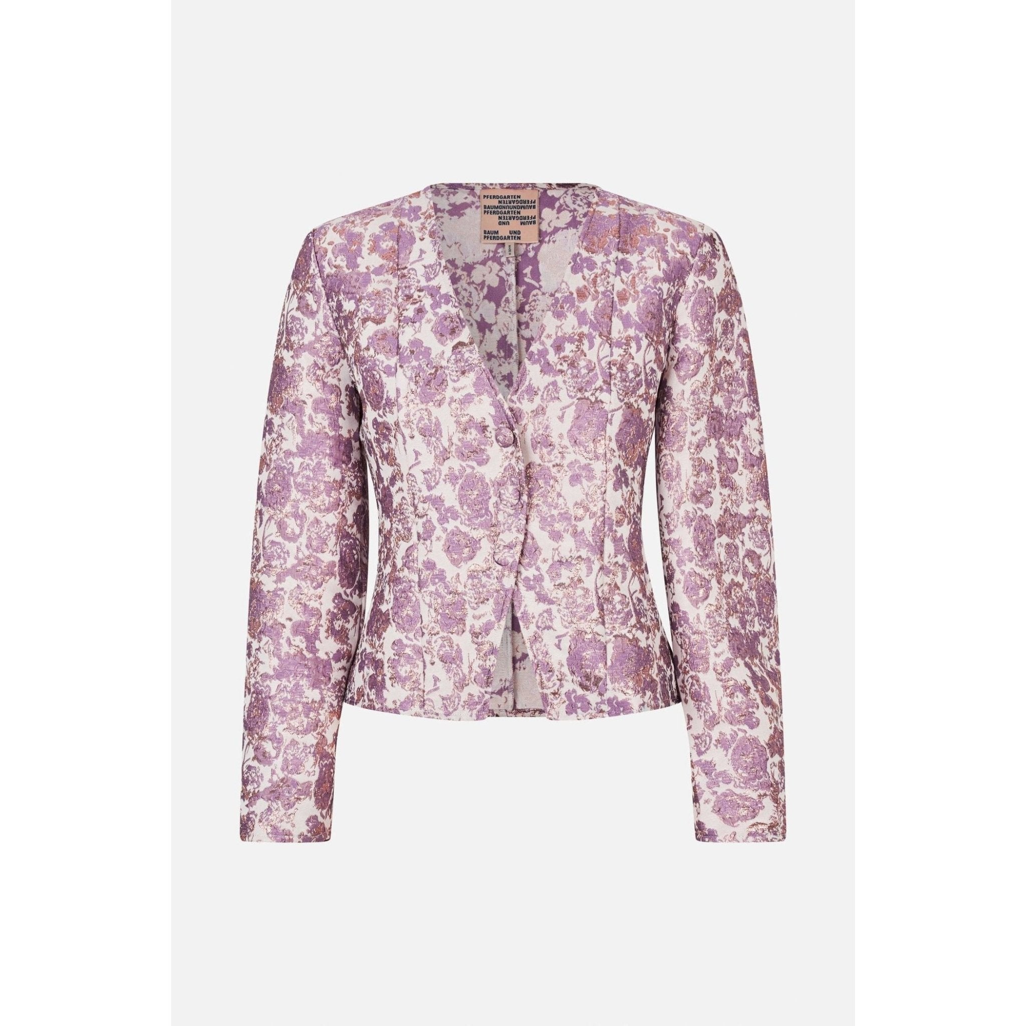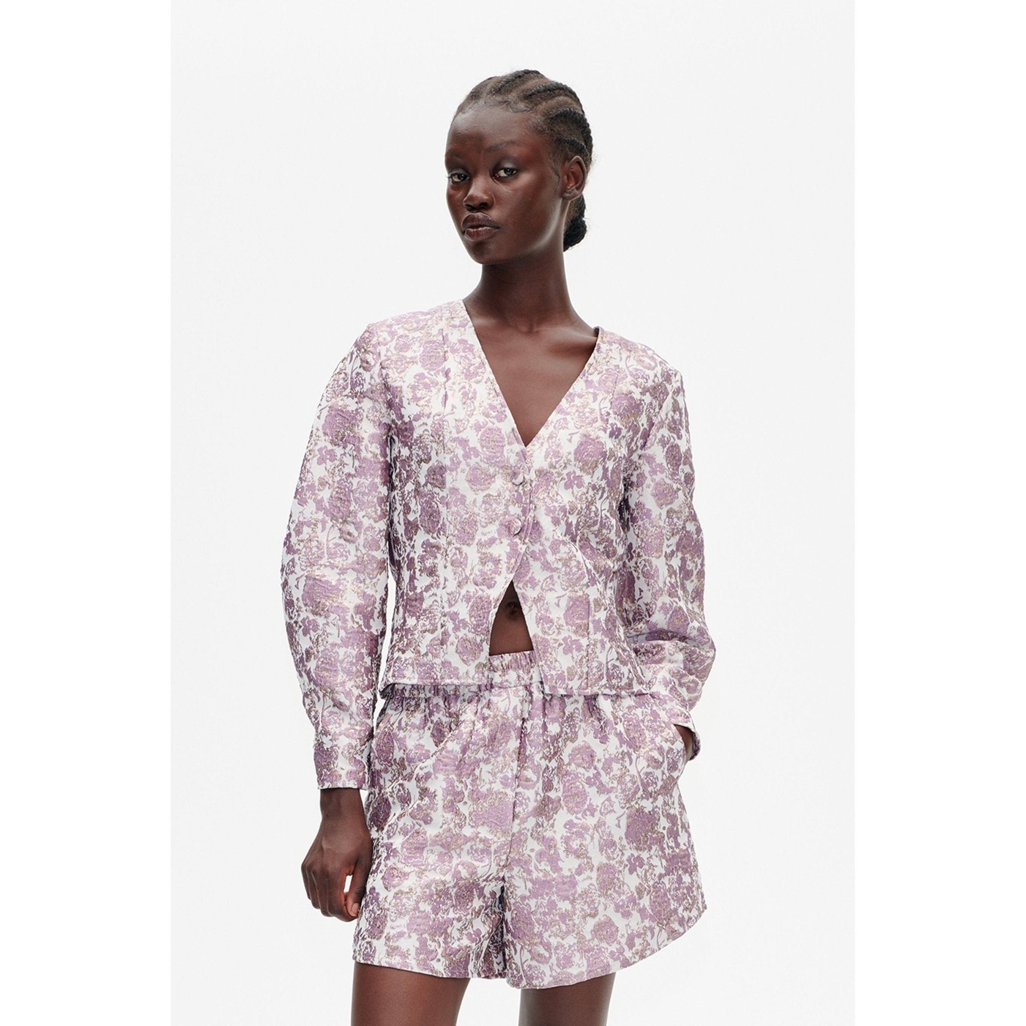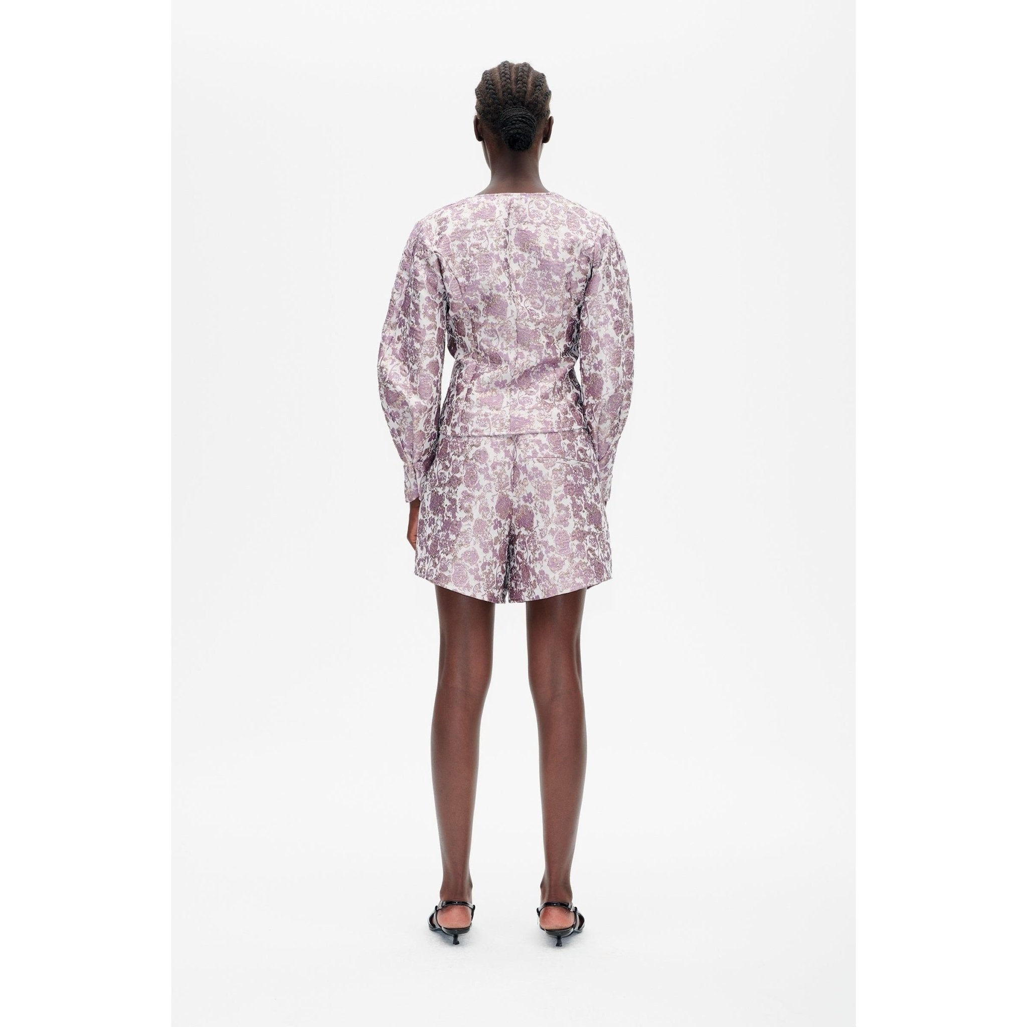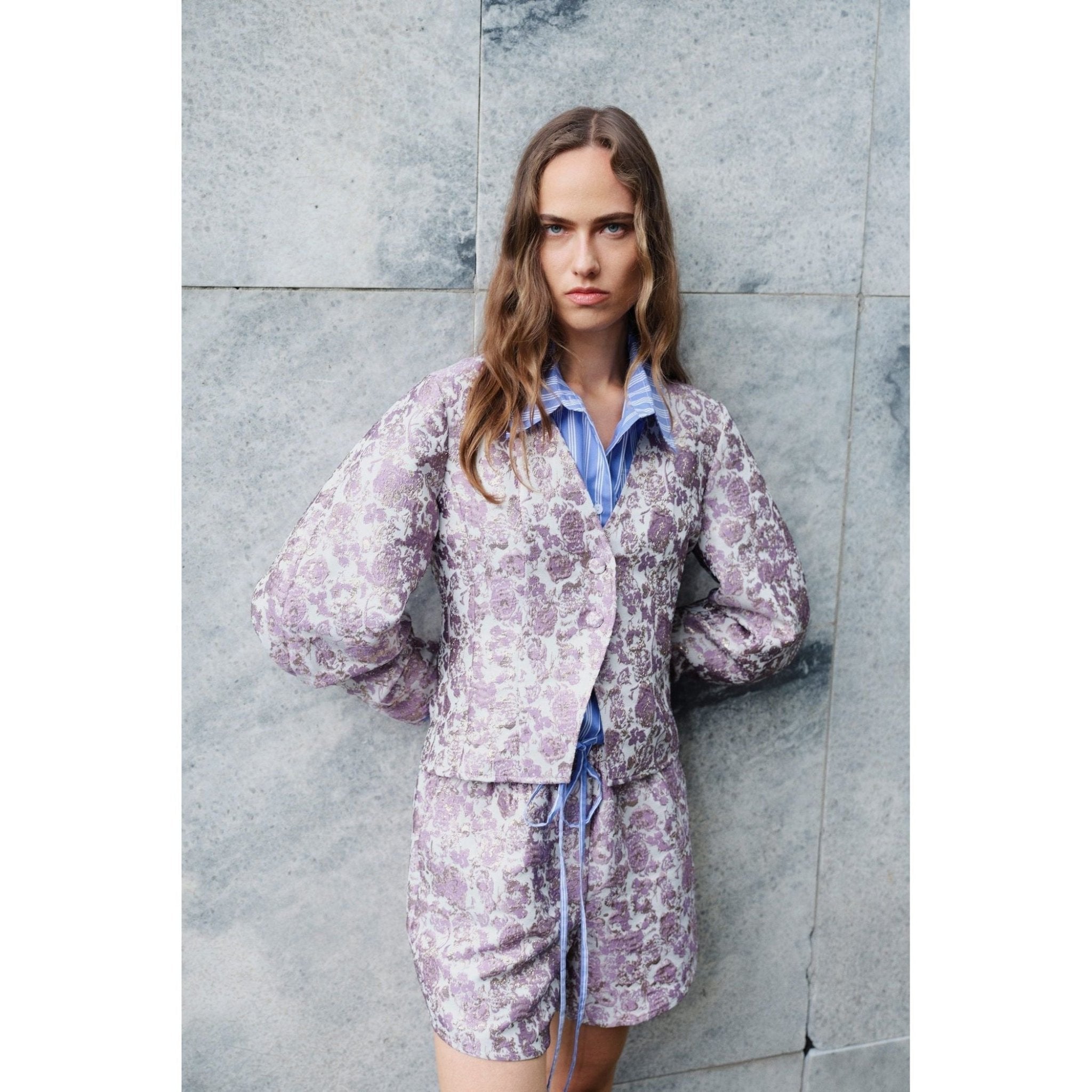 The Milie Blouse is crafted from structured jacquard fabric with metallic threading, creating a sophisticated shimmer and a bold, statement-making design. Its fitted silhouette and V-neck offer a flattering, polished look, while voluminous sleeves add a dramatic flair. The button closure on the front ensures a timeless finish. Pair the Milie Blouse with our Nela Shorts and heels for an elevated evening ensemble, or style it with high-waisted jeans and sneakers for a chic, casual vibe.