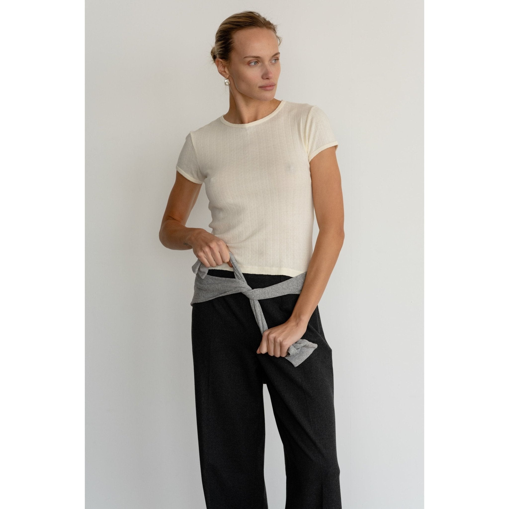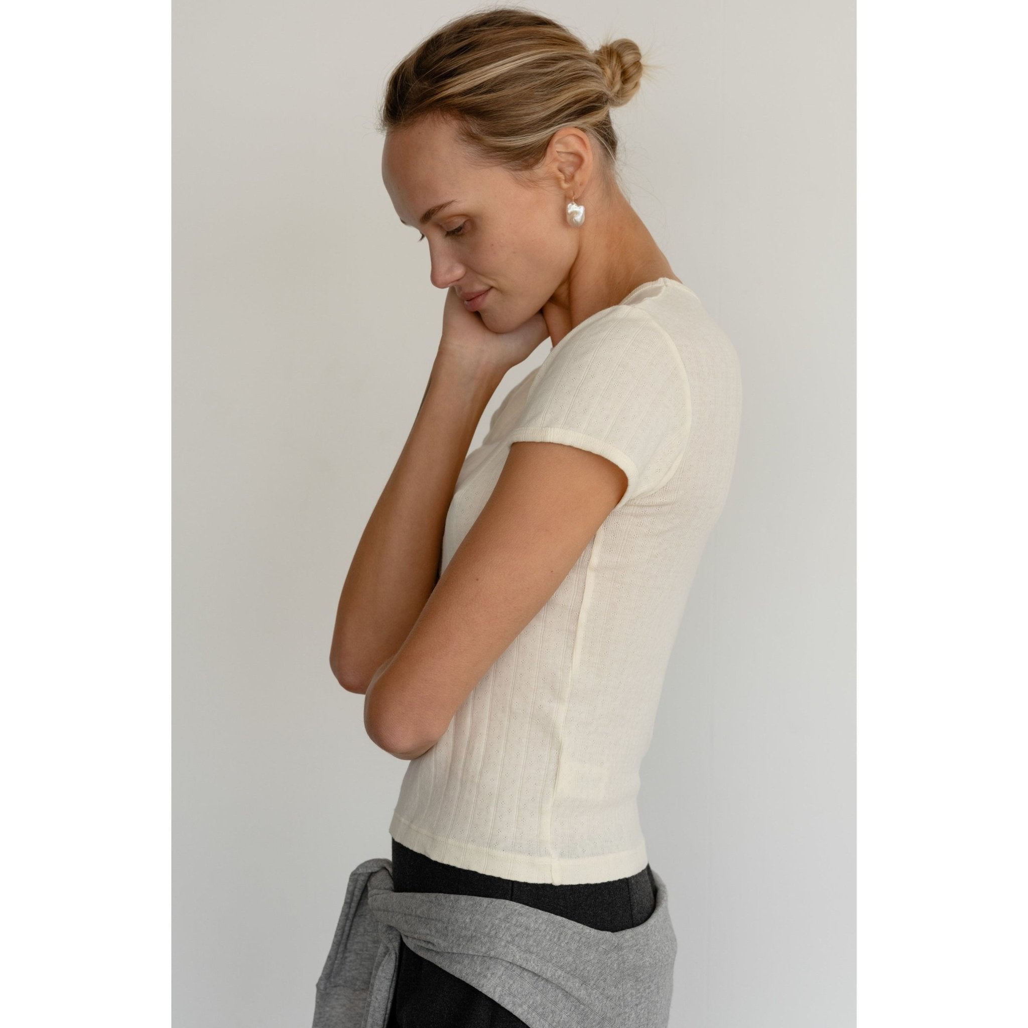The Pointelle Baby Tee is crafted with 100% Organic Cotton, featuring a slim-fit, crewneck, and cap sleeves.Made in Los Angeles