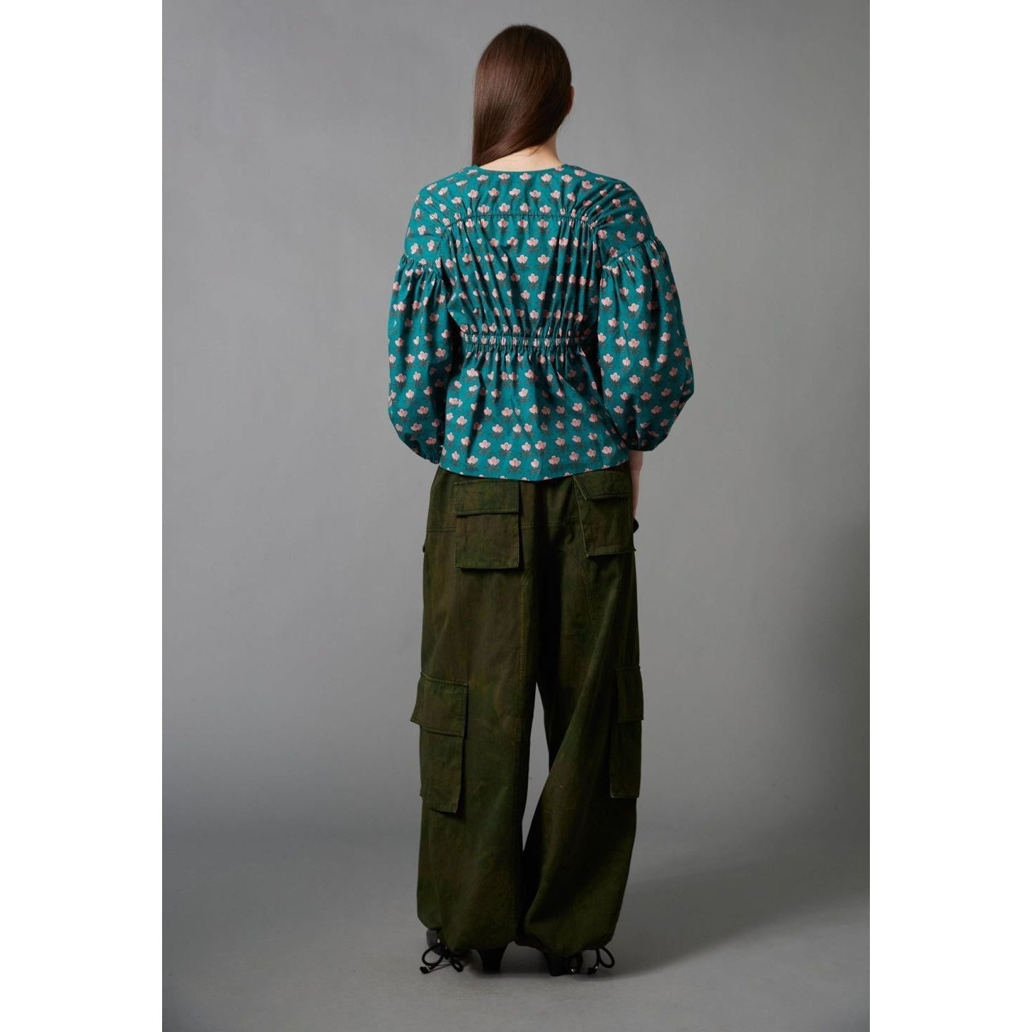 Shirred bodice blouse has an empire waist and tasseled drawstring ties at the front chest. Full, elbow length, sleeves have elasticated cuffs.