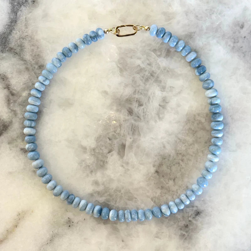 Stone details: 6 - 7mm rondelle-cut shaded blue opal beads. These are natural stones, slight variation in color my occur between strands.