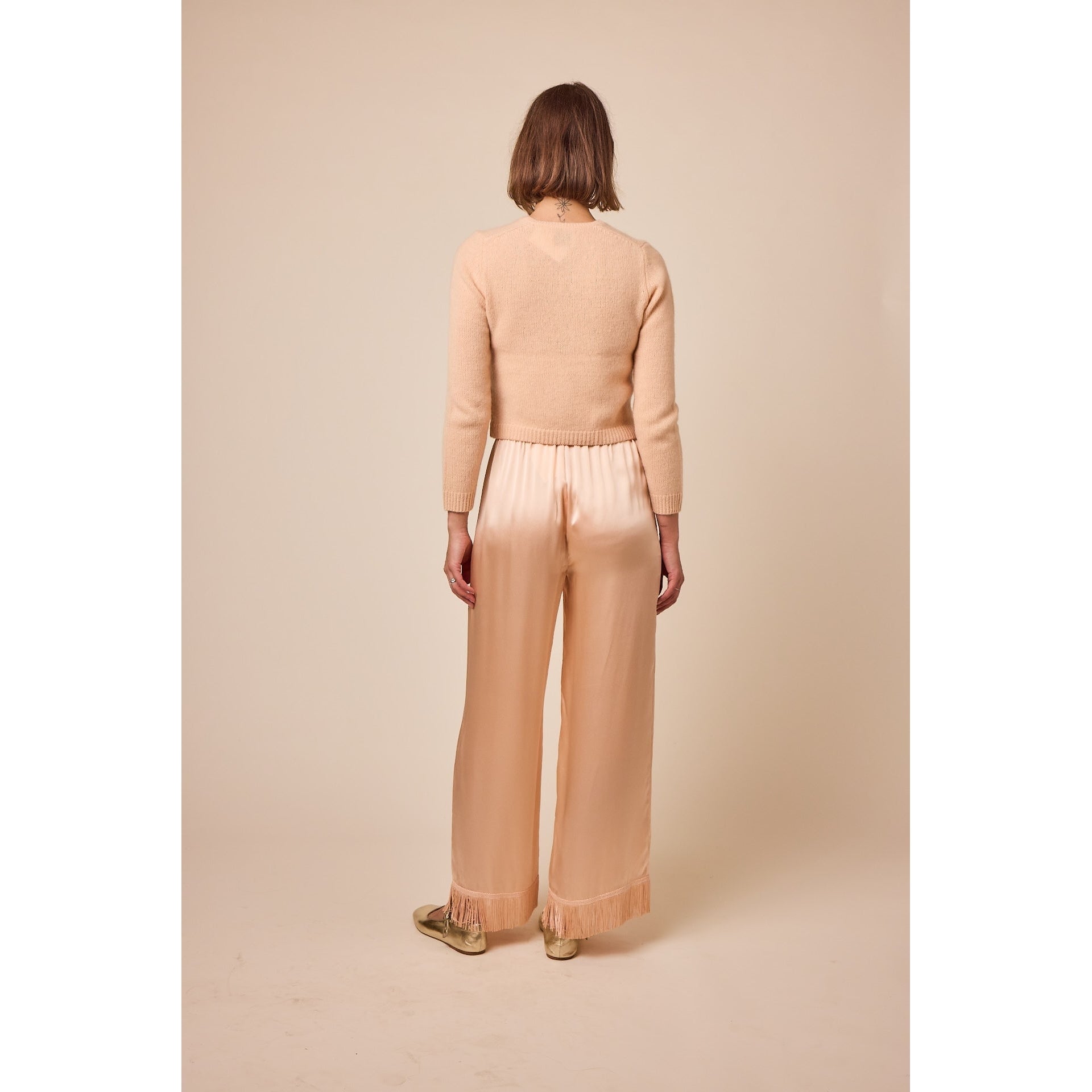 Cut from luminous silk satin, our Lavon Fringe Pant is an effortlessly polished pull-on style finished with fluid, silky fringe. The high waist is trimmed with elastic scallop detailing for an easy, comfortable fit.